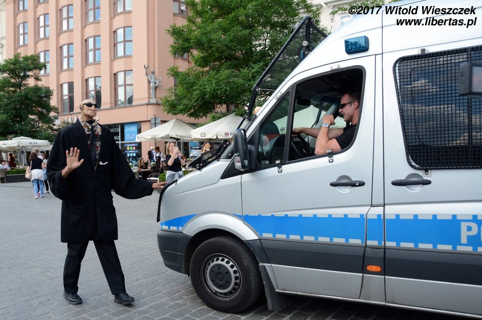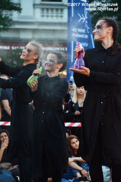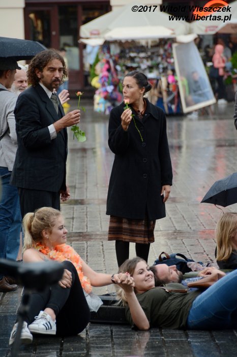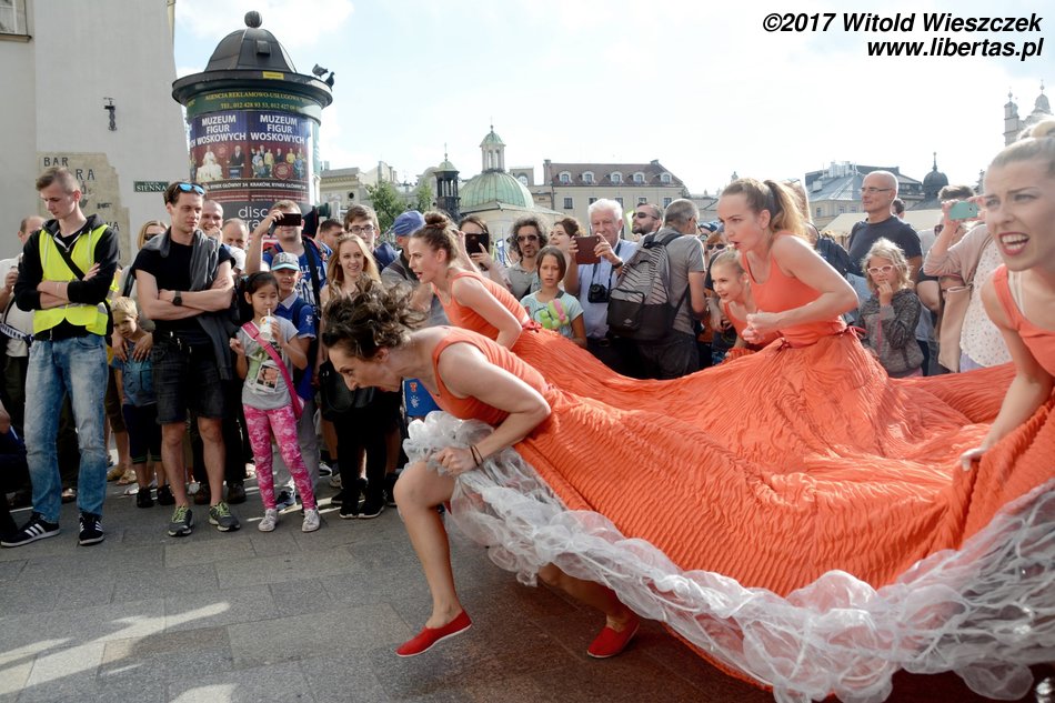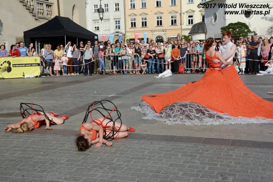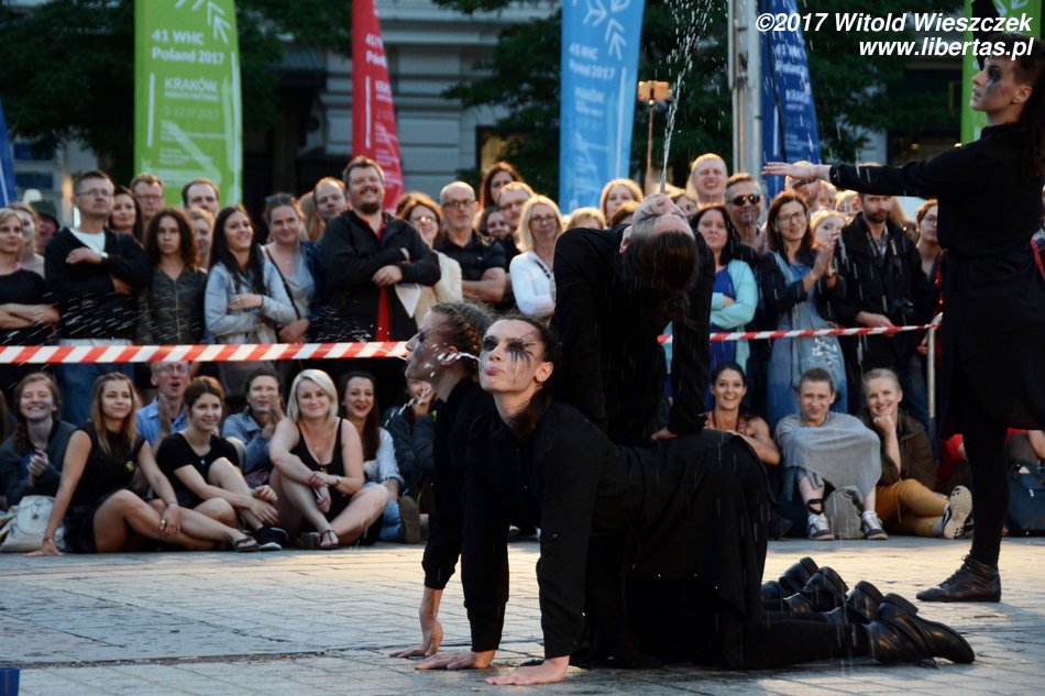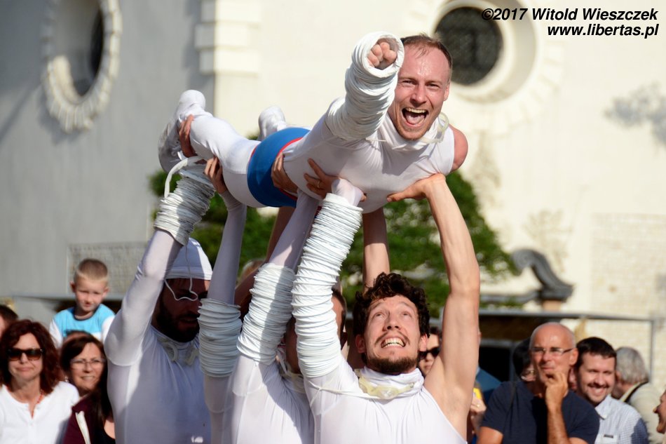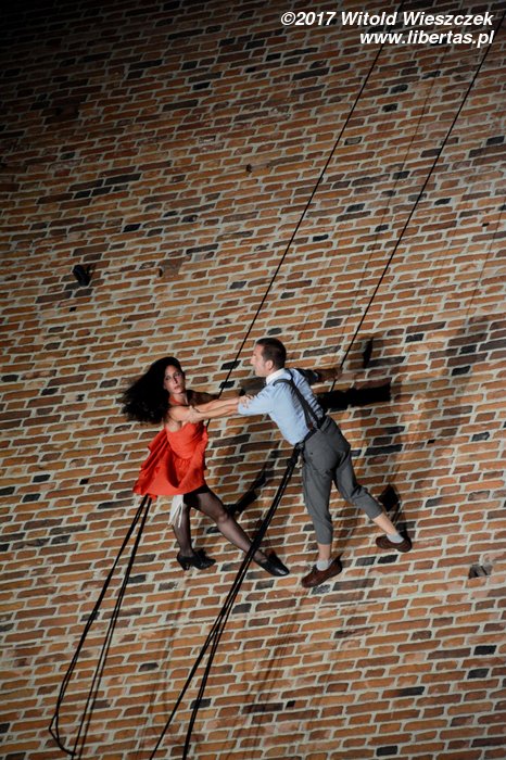 Dwoje ludzi oszukujących prawa grawitacji tańczy na pionowej ścianie, próbując utrzymać równowagę i harmonię, stać się jednością. Delrevés vertical dance to kolejna grupa, która gości w Krakowie nie po raz pierwszy. Ich specjalnością są tańce na linach i chyba upodobali sobie Ratusz, bo o ile mnie pamięć nie myli, za każdym razem wyczyniają te swoje akrobacje właśnie na jego starych murach...