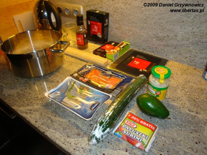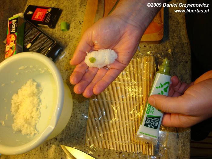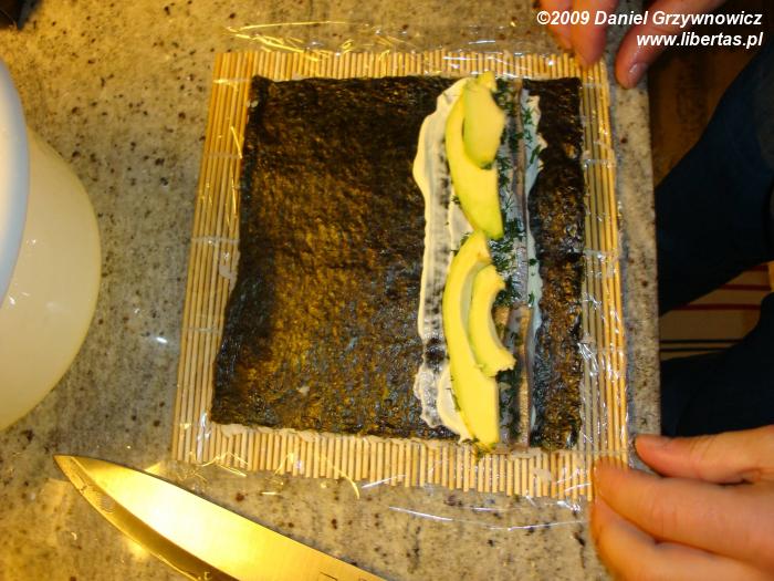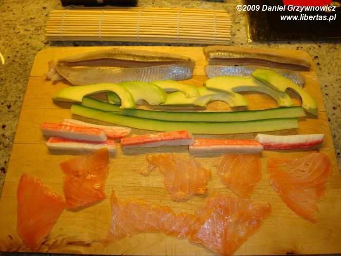 Na koniec dodam, że proponowane przeze mnie składniki nie są przypadkowe, lecz mają za zadanie zachęcić do jedzenia sushi. Jeśli wcześniej zraziliście się jedząc sushi z surową rybą, to proponuję dać sushi drugą szansę i spróbować przyrządzacie samemu na bazie powyższych składników. Nadmienię jeszcze, że ja uczyłem się pod okiem kolegi pochodzącego z kraju kwitnącej wiśni. Oczywiście jako nadzienie możemy użyć także innych składników, np. kawioru, małży, surowych lub wędzonych ryb, grzybów, etc...