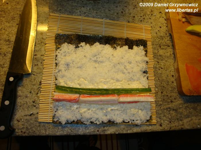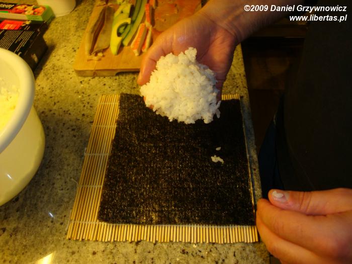 Na macie układamy jeden płat nori. Zaczynamy nakładać ryż. Aby ułatwić sobie zadanie należy przygotować sobie wcześniej miseczkę z wodą i przed nabraniem ryżu zamoczyć ręce aby były wilgotne. Nabieramy sporą garść i układamy na środku płata nori po czym rozkładamy go równomiernie do brzegów. Warstwa ryżu nie może być zbyt gruba. Po równomiernym rozłożeniu ryżu do trzech krawędzi, na przeciwległej do nas krawędzi zostawiamy około centymetrowy margines wolny od ryżu. Na 1/3 wysokości płata układamy składniki.