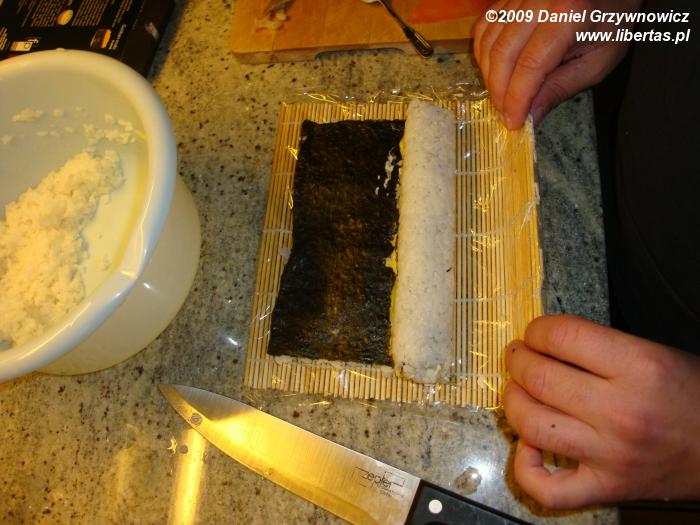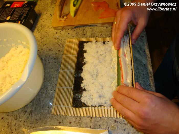 Smarujemy majonezem około 2-3 cm pas. Następnie układamy paluszki surimi obok siebie wzdłuż w taki sposób, aby nie nachodziły na siebie (Uwaga! dotyczy to wszystkich składników). Następnie kładziemy ogórek albo awokado i zaczynamy zwijać. Robi się to na dwa razy. Dosuwamy płat nori do krawędzi maty przy której stoimy i zwijamy w taki sposób aby krawędź maty zakryła płat nori i z wyczuciem równomiernie dociskamy. Nie przejmujcie się jeśli składniki zaczną lekko się wysuwać – końce będą odkrojone. Teraz drugim ruchem zwijamy do końca – margines bez ryżu, który zostawiliśmy potrzebny był po to, aby rulon się skleił. Jeśli wyszło wam coś lekko kwadratowego zamiast walca należy na macie uformować rulon aby nabrał kształtów. Układamy na talerzu łączeniem do dołu i przygotowujemy kolejny.