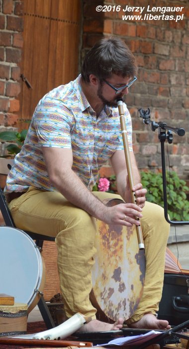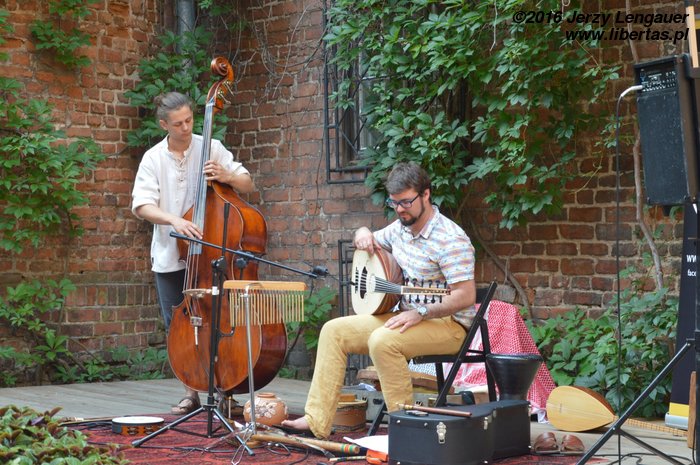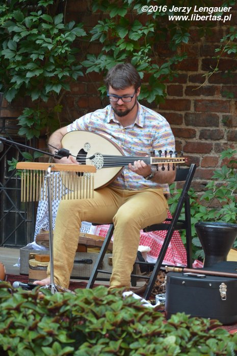 Niedzielne popołudnie to domena biblijna. Ach, właśnie! Jak pięknie wpasował się Michał Kaczor w dzień odpoczynku starotestamentowego Boga. Odpoczywamy i słuchamy. Jakie piękne ukoronowanie dnia, który należy święcić na pamiątkę zmartwychwstania, albo pierwszego dnia po szabasie… W każdym razie Michał Kaczor zaprosił wszystkich do… Izraela. Z pewnością przeczytacie Państwo wiele ciekawych rzeczy o bohaterze przedostatniego dnia Jarmarku na stronie internetowej, której reklama stanowiła małą, chybotliwą ściankę za plecami wykonawców: www.muzycznepodroze.pl. Raz serca publiczności zadrżały. Wietrzyk, ten od anielskich obłoczków, zawirował na dziedzińcu, powiał gdzieś od kościoła św. Jerzego, pewnie na wieść o muzyce wczesnochrześcijańskiej, i ścianka upadła. Okazało się wówczas, że jest delikatna, skromna i niegroźna. Tak delikatna, jak towarzyszący Michałowi Kaczorowi kontrabasista. I tutaj przepraszam. Nazwisko do mnie nie dotarło. Padło z pewnością imię. Na początku Ziemowit. W trakcie koncertu – Ziemek. Nie mogłem się oprzeć wrażeniu, że z urody, zachowania, aparycji, wdzięku scenicznego, swobody wypowiedzi, dojrzałości gry na instrumentach (bo pewnie nie tylko opanował sztukę gry na kontrabasie), znakomitego śpiewu i owego bardzo rzadkiego czegoś, co mają wyjątkowi artyści: ruchu dłoni, rąk i całego ciała, mimiki podczas śpiewania, gdy są oddani wykonaniu, przejęci, przechodzą niejaką artystyczną katharsis, otwierają drzwi satori… Owszem, Michał Kaczor to główna postać projektu Muzyczne Podróże, swojego rodzaju bajarz, podróżnik-szaman, muzyczny etnograf i antropolog, ale gwiazdą tego dnia był ktoś inny. Być może jest tak zawsze. Na zdjęciach strony internetowej projektu widać przeróżne postaci grające na różnorakich instrumentach, chociaż Michał Kaczor jest instrumentalistą. Wprowadza, zaprasza, uczy, rozszerza, pomaga, wciąga? Z ucznia stał się nauczycielem. Zatem wielka postać i powinniśmy być bardzo wdzięczni za bezpłatny koncert w Kętrzynie. Tenże nauczyciel wstawał co jakiś i opowiadał. O trudach życia artysty. Takiego właśnie. O czterech krajach, które są w sensie muzycznym dla niego najważniejsze. Dziwne, mnie wyszło pięć. A zatem: Izrael, Jordania, Turcja, Egipt, Syria. Być może pomyliłem i któryś wtrąciłem, sugerując się bliskością geograficzną i poniekąd kulturową. Ileż kłopotu jest z przewożeniem instrumentów. Pamiętajmy, to są oryginalne przedmioty kupowane na Bliskim Wschodzie i tuż za biblijnym Morzem Czerwonym. Czasami za dolara, jak sam opowiadał, a być może i kosztowniejsze. Wiemy, że tamże pobierał nauki. Choćby w Ammanie. Nie trzymał ich tego dnia przy sobie. Grał i podnosił do góry. Potem przekazywał publiczności. Przekazywał w ręce. Ale… zabraniał grać. Opowiadał, czym różnią się tureckie od innych. Gdzie są dzwonki, gdzie talerzyki, czy coś tam innego, co charakteryzuje odpowiednią kulturę, bądź kraj pochodzenia. Pokazywał różnice dźwięku wydobywanego z instrumentu wykonanego z materiałów dawnych a obecnych. Rozwodził się nad strojeniem, jak robiono to nad ogniskiem, czego on na dziedzińcu zamku nie zrobi…