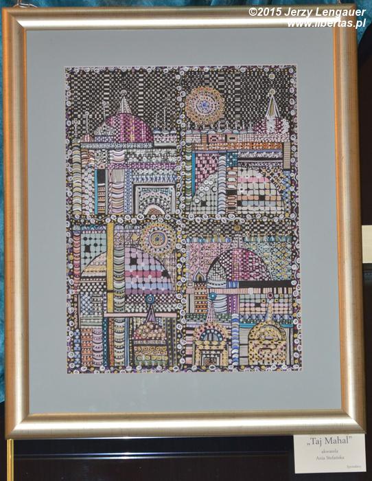 Krok dalej i labirynt kolorów. Ileż dalekowschodnich konotacji! Wystarczy spojrzeć na jeden z tytułów. Taj Mahal. Artystka zafascynowana wschodem układa architekturę europejską jak tybetańscy mnisi mandale w klasztorach zbudowanych na wysokości kilku tysięcy metrów. I tutaj rzeczywisty świat się kończy. Malarka w sztuce, budownictwie naszego świata dostrzega coś niezwykle kolorowego, ale to tylko pozór. Bo w tych z trudem ogarniętych ludzkim okiem kolorach jest zamysł jakiejś boskości, szukania innego ducha gdzieś na dachu świata. Poszukiwanie drobinki, z której układany jest świat. I chodzi już nie o budowle z materiałów trwałych, ale budowanie duszy, bycia, człowieczeństwa. Jakże to symptomatyczne, oglądanie tychże obrazów w Loży wolnych mularzy, pod dachem Wielkiego Budowniczego tego świata.