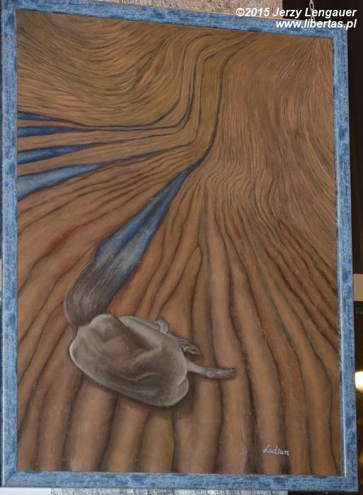 Zamarłem, zatem. Od lewej, czyli od wejścia ciągnął się nierówny rząd traumatycznych obrazów egzystencji współczesnego człowieka, osadzonych jednak w jakimś fantasmagorycznym, sennym aspekcie atawizmu, antropologii. Jakby wycinki z ciężkich, męczących, delirycznych, na pół przesypianych nocy. Kolorami niewychodzącymi poza odcienie brązu, szarości, czerni, gdzie nie mają prawa bytu radość intensywnego błękitu czy żółci, bądź frywolne lub nawet infantylne róże i biele. Obszar pesymizmu. Uwiązanie, brak nadziei na wolność optymizmu. Jedyna swoboda w samotności, choć także na rozciągniętej linie, która zdaje się, że za chwilę ściągnie boleśnie skuloną, samotną, bezwolną jednak postać. Tę boleść w obrazach potęguje, czy podkreśla więź ludzkiego życia z cierpieniem wynikającym z nieuniknioną koegzystencją z nieprzyjazną przyrodą, która w zamyśle artystki nie jest opiewanym w poezji radosnym wybuchem świeżej zieleni i kolorowych kwiatów.