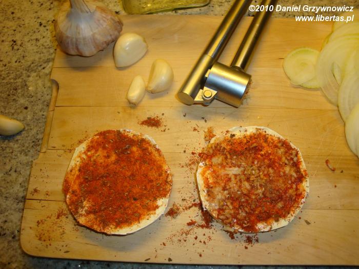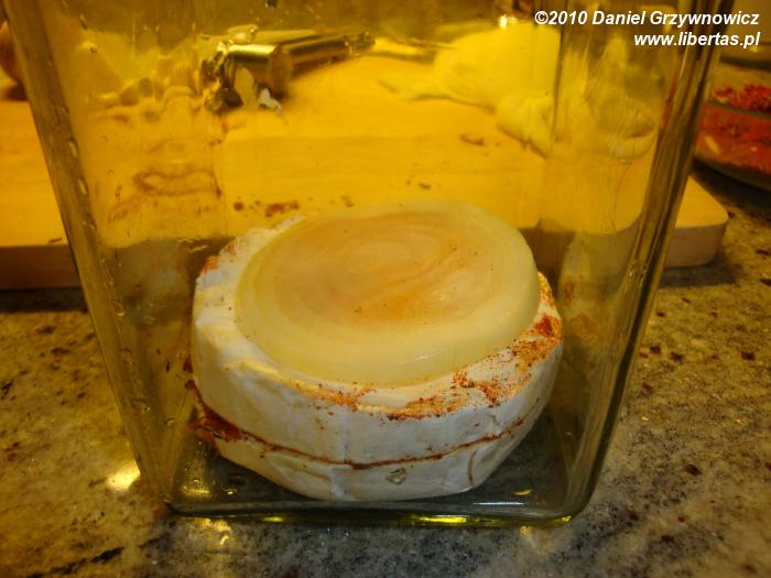 Dodatkowo potrzebny jest słój z szerokim wiekiem – standardowy posiada za małą średnicę. Ser przecinamy wzdłuż na dwie połówki. Wyciskamy przez praskę na jedną połówkę dwa ząbki czosnku. Posypujemy obficie papryką słodką, dodajemy odrobinę ostrej i pieprzu Cayenne. Składamy z powrotem i podobnie postępujemy z pozostałymi serami.