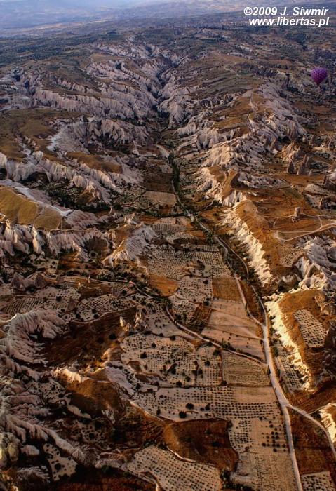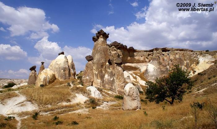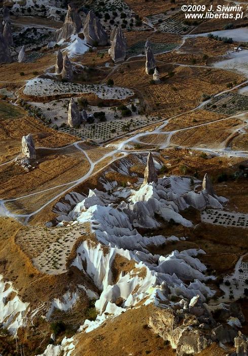 Przed wyjazdem do Turcji dobrze byłoby wiedzieć kim był pierwszy prezydent tego kraju, Mustafa Kemal Atatürk. To on lata temu stanął na czele ruchu nacjonalistycznego i obalając sułtanat, zakończył epokę imperium ottomańskiego. Gdybyśmy my, Europejczycy i Amerykanie, nie byli tak samozachwyceni ustrojem demokratycznym, musielibyśmy przyznać, że rządy autorytarne (coś w rodzaju monarchii, koniecznie oświeconej!) są dla każdego państwa niezwykle korzystne. Atatürk zmodernizował i zeuropeizował Turcję, oddzielił struktury państwa od kościoła, wprowadził alfabet łaciński, kalendarz gregoriański, zapoczątkował używanie nazwisk oraz zagwarantował równe prawa kobietom. Stał się ojcem wszystkich Turków i sprawił, że naród turecki poczuł się dumny ze swego pochodzenia. Rzeczywiście, gdy się tak zastanowić, nie widziałem w tym kraju smętnie snujących się tubylców ze zwieszoną głową, depresyjnym spojrzeniem, wiecznie narzekających i z ciężarem kompleksów na plecach, co w Europie jest niestety standardem. Turcy są uśmiechnięci, życzliwi i nawet kiedy są zmęczeni, widać w ich oczach radość życia. Najbardziej można to było dostrzec w Kapadocji. Być może dlatego, że tam spędziliśmy najwięcej czasu. Jeszcze przed wyjazdem założyłem, że całą swoją uwagę poświęcę głównie tej, jak ją nazywają, krainie pięknych koni. Jak tylko zobaczyłem folder z baśniowymi fortecami, wiedziałem, że przywiezienie stamtąd zdjęć jest moim bezwzględnym obowiązkiem. To jedyny region na ziemi, który może pretendować do miana „księżycowego krajobrazu”. Lekkie, porowate skały, złożone z piasku i popiołu wulkanicznego są plastycznym tworzywem, które od wieków wykorzystywali mieszkańcy do różnych celów. Wszystko zaczęło się miliony lat temu, kiedy to trzy szczyty Kapadocji – Erciyes, Hasandağ i Güllüdag – dojrzały do tego, aby zawrzeć, zabulgotać i oznajmić całemu światu o swoim istnieniu. Lawa wylewała się z nich jak miód z garnka i dawała początek nietypowej rzeźbie terenu. Dołączyły do tego mniejsze góry wulkaniczne, a tuf, za sprawą deszczu i wody z jezior i rzek, został poddany erozji. Co lżejsze i słabsze skały zostały wypłukane przez wodę i usunięte przez wiatr, pozostały tylko te bardziej twarde, które my nazywamy grzecznie „magicznymi kominami”, a miejscowi prostują ze śmiechem, że są to pyszniące się w całej okazałości fallusy, w różnych kształtach, od stożkowych, przez szpiczaste, aż po te udające grzyby.