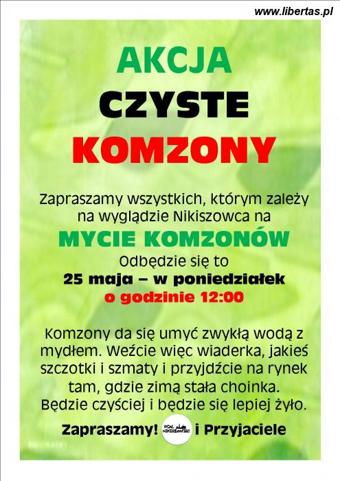 W poniedziałek 25 maja 2009 roku w samo połednie na Nikiszu zacznie sie nowo akcja „Myjymy Komzony”. Inicjatorym cały akcji jest PCAL Nikiszowiec i ludzie skupiyni kole nich. Musza wom trocha porozprowiać o co sie rozłazi? To na początek wom powiym co to takiego som te komzony. Komzony to jest nazwa lokalno naszych sklepów, kiere mieszczom sie w podciyniach na rynku na Nikiszu. A jak się idzie w te podciynia, to się godo, że to jest pod Komzonami. Nasz słownik nazw lokalnych zaś godo tak: Komzony - Ciąg sklepów pod arkadami na rynku w Nikiszowcu. To już wiycie, że tam som sklepy, dwa spożywcze, jedyn z gazetami i jest coś na co jo godom „ściana płaczu” – to jest takie trocha smutne miejsce kaj wiszom klepsydry. Kiedyś pod komzonami od czasu do czasu rozkładały się takie omy co sprzedowały choinki abo bazie, w zależności od tego jakie akurat były świynta. Jo w swoim monologu kiery mie zaprowadził w zeszłym roku aż do półfinałów na Ślązoka Roku tak o tym godałach: