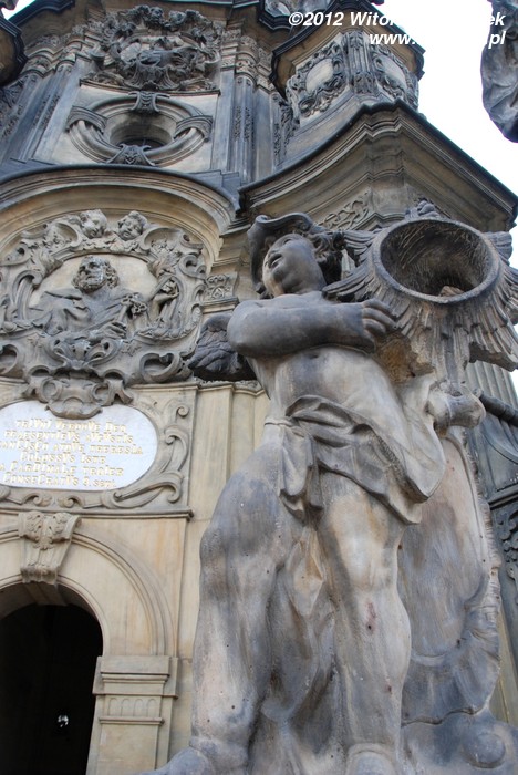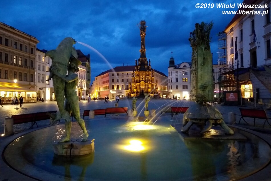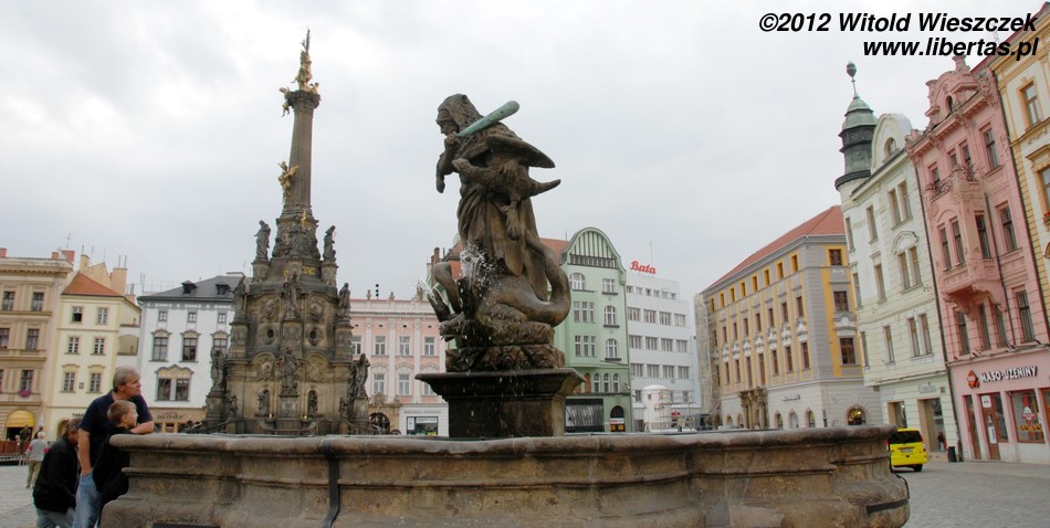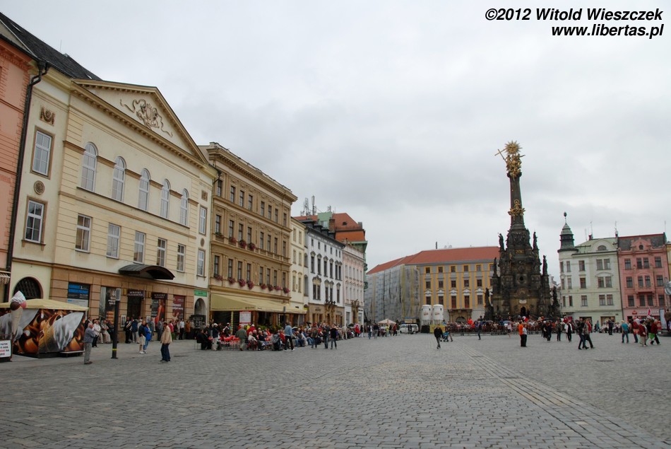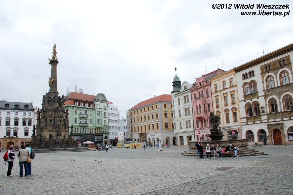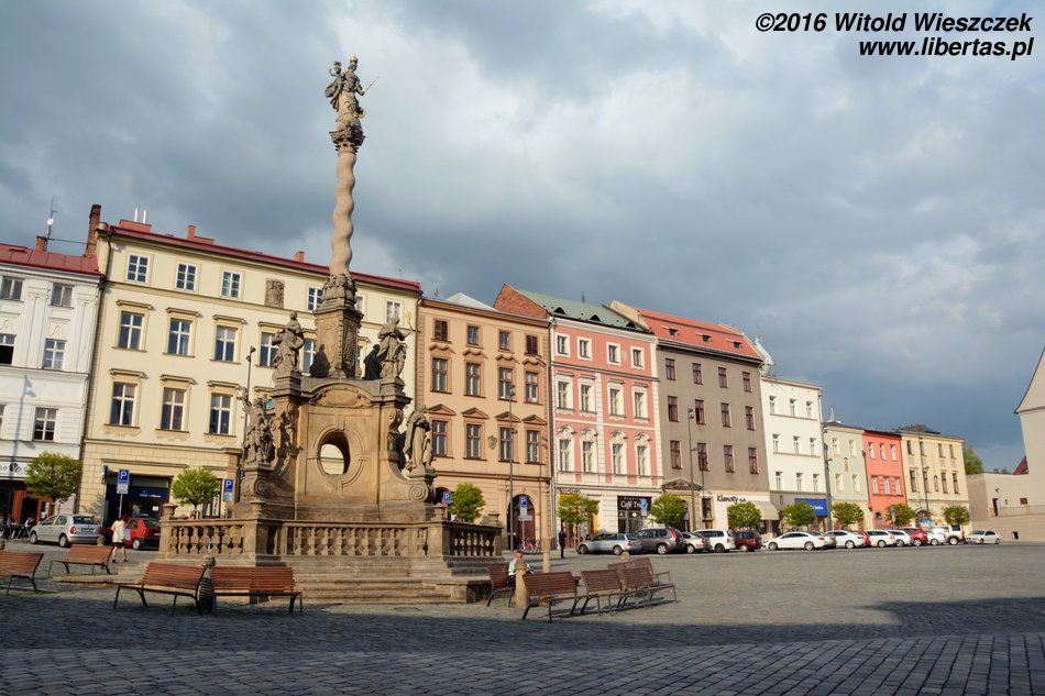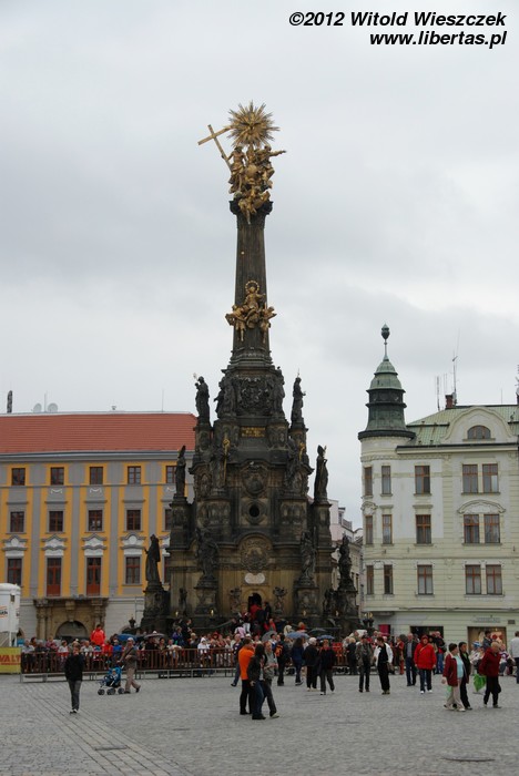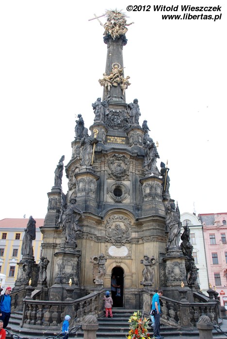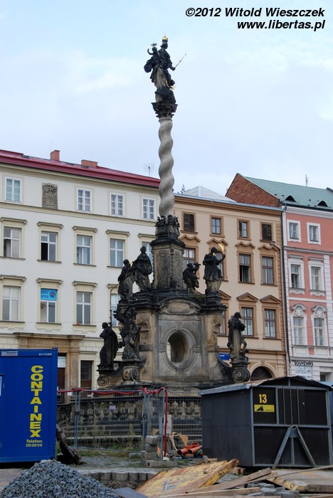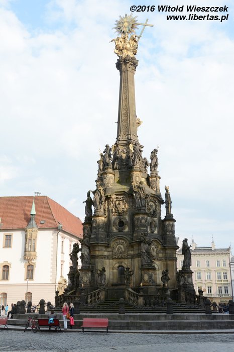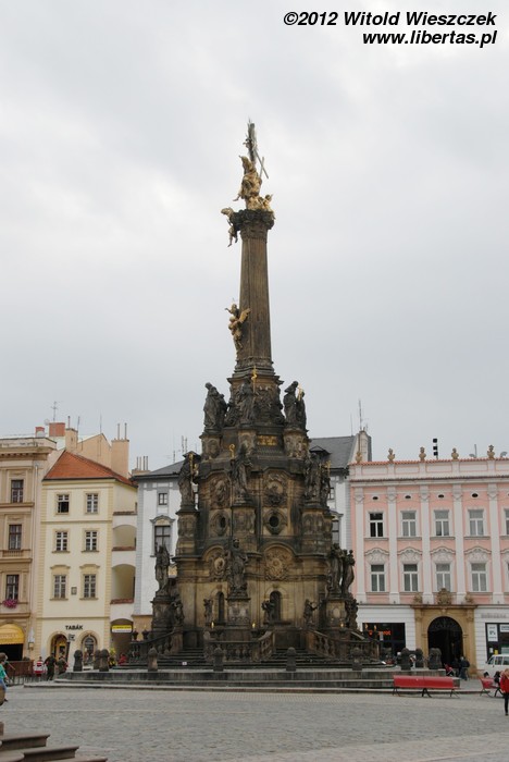 Wzniesiona w latach 1716–1754 Kolumna Trójcy Przenajświętszej zbudowana została na planie koła o średnicy około 17 metrów i ma 35 metrów wysokości, czym zdecydowanie zwraca uwagę każdego wchodzącego na Rynek turysty. W jej budowie brali udział wyłącznie artyści z Ołomuńca, a autorem ogólnej koncepcji był architekt i kamieniarz Wacław Render, który na początku również kierował budową prowadzoną – dodajmy – z własnej kieszeni. Na ten cel zapisał on zresztą również cały swój majątek. Jest to największa tego typu barokowa grupa rzeźb w Europie Środkowej, a jej bogata dekoracja składa się z 18 posągów świętych, 12 figur niosących światło (lucyferów) oraz wielu płaskorzeźb w tym przedstawiających 12 apostołów.