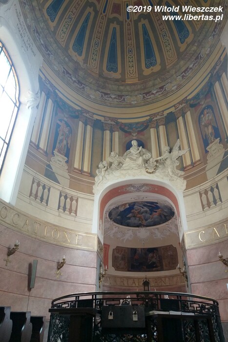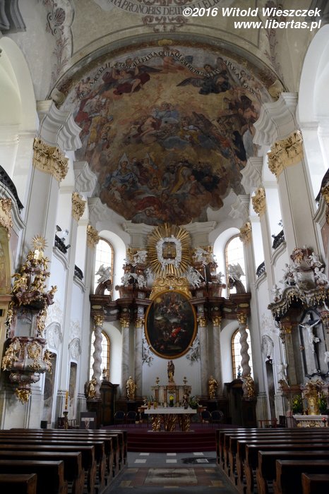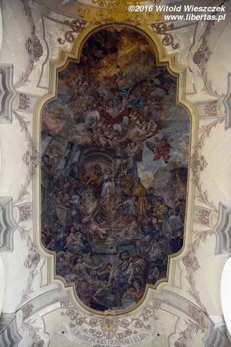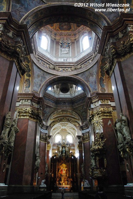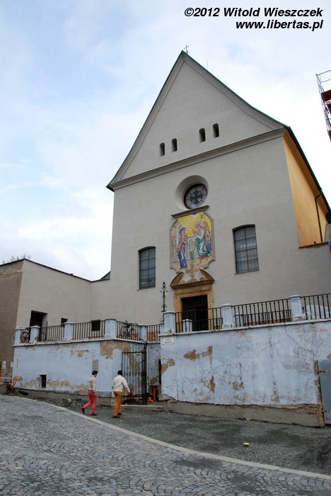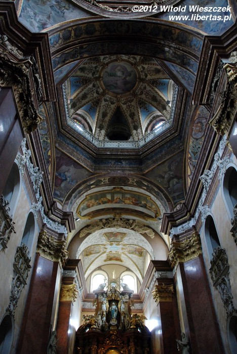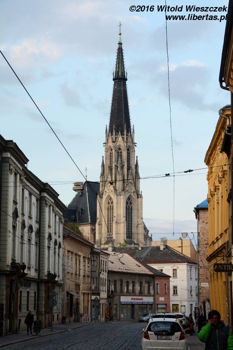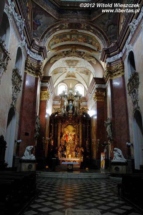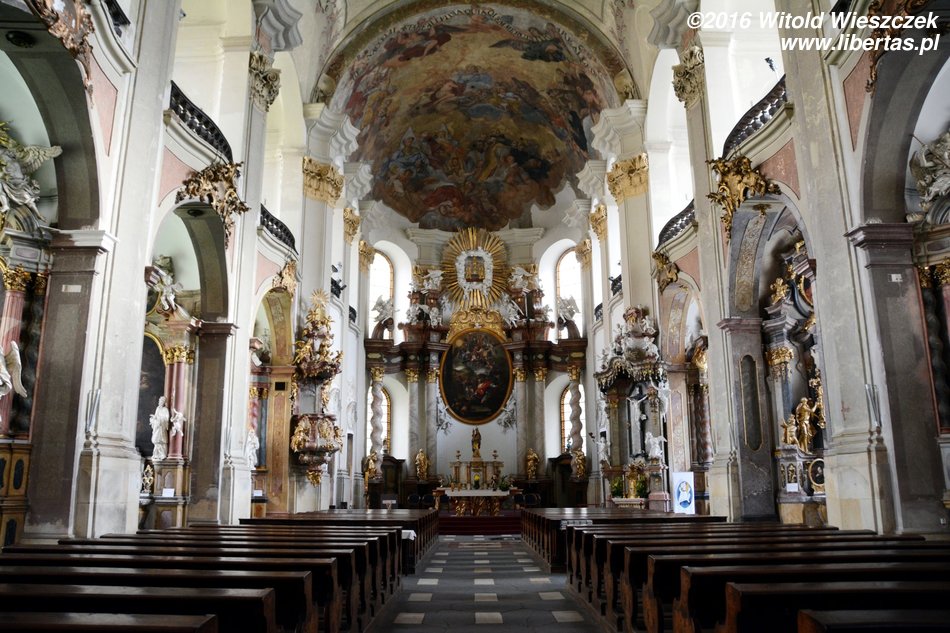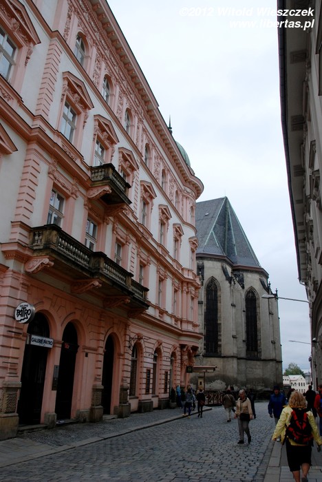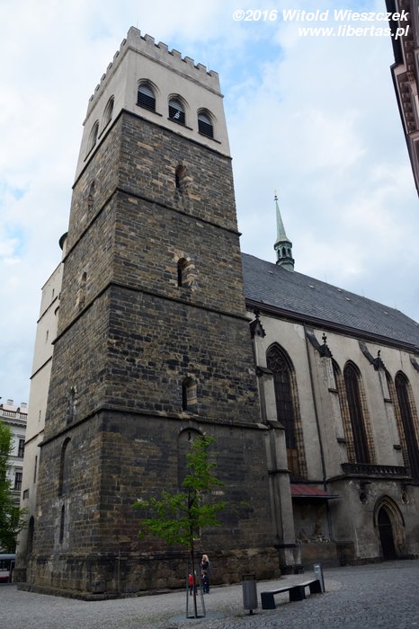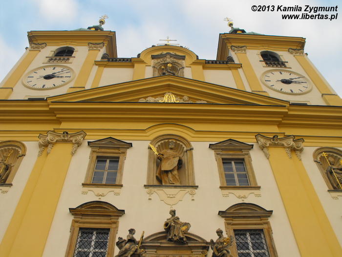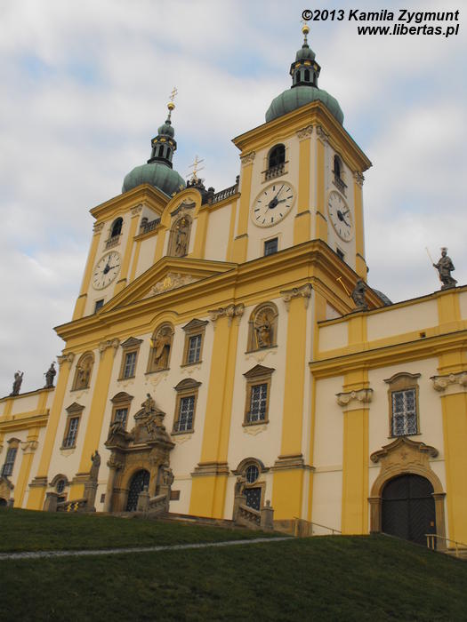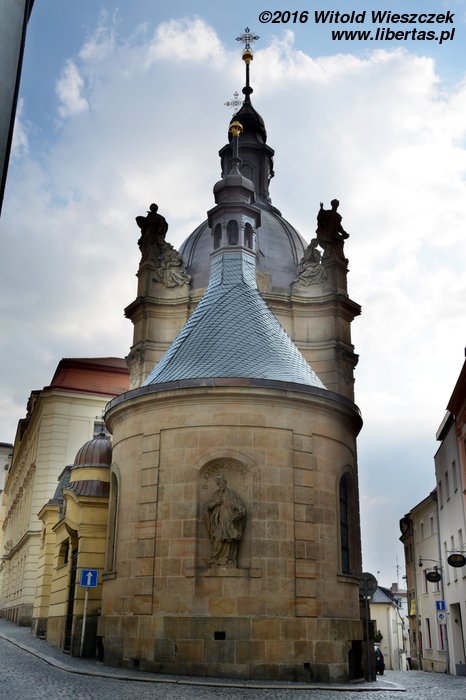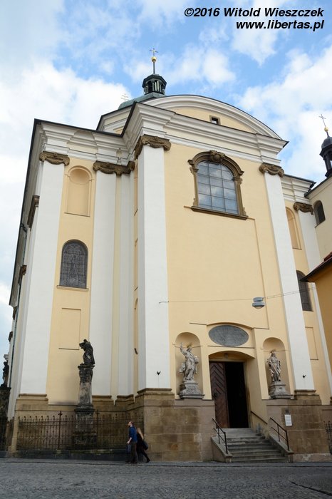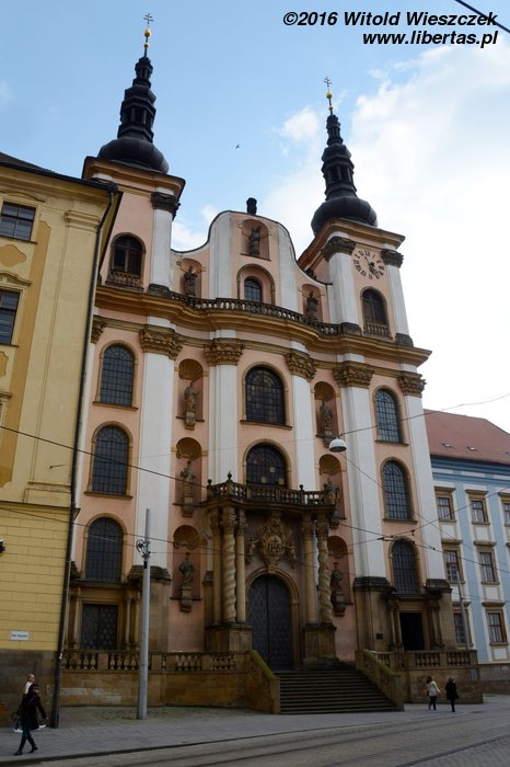 Stojący w tym miejscu wcześniejszy gotycki kościół został poświęcony pod koniec XIII wieku, jednak do dzisiaj zostały z niego tylko mury obwodowe i część sklepienia prezbiterium. Obecny wygląd jest efektem gruntownej przebudowy wymuszonej przez zniszczenia, jakich dokonano w czasie wojny trzydziestoletniej. Remont został przeprowadzony w latach 1673–1702, a nowy jednonawowy budynek został uwieńczony trzema kopułami. Zewnętrzny wygląd kościoła nie zdradza, że kryje on zapierające dech w piersi bogate barokowe wnętrze, odnowione ostatnio w 1897 roku. Nie widziałem wszystkich kościołów w Ołomuńcu, ale to z pewnością jeden z najpiękniejszych. Naprawdę warto go odwiedzić.