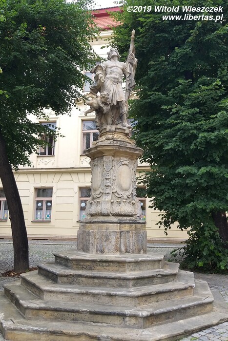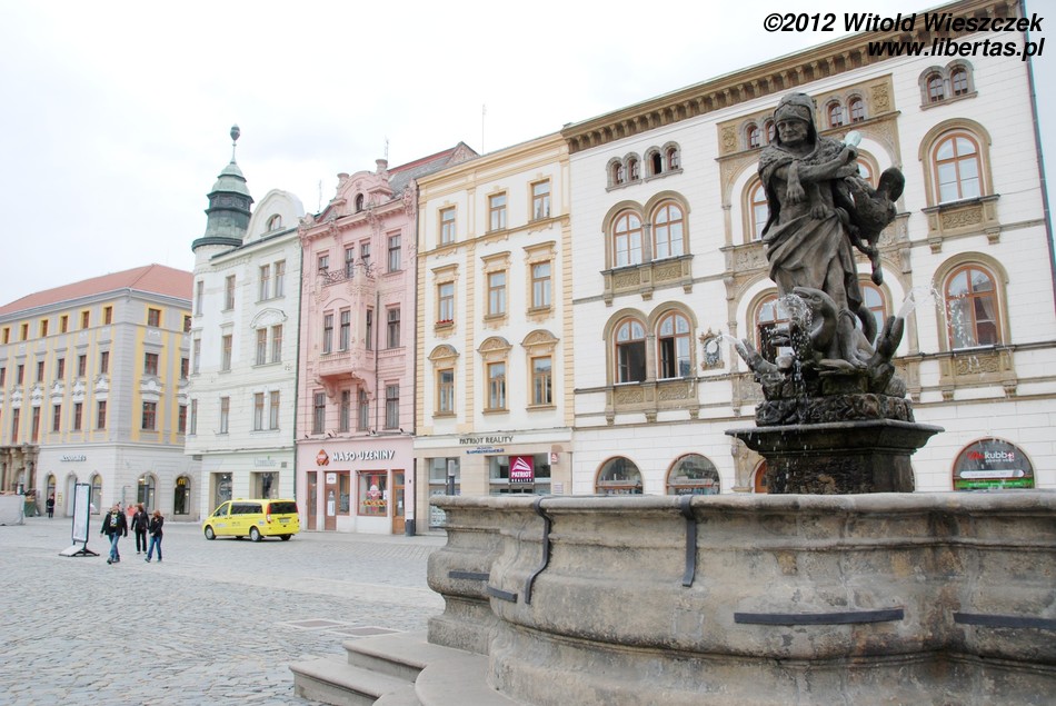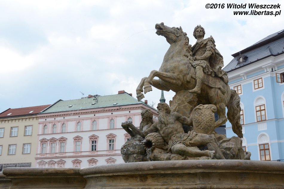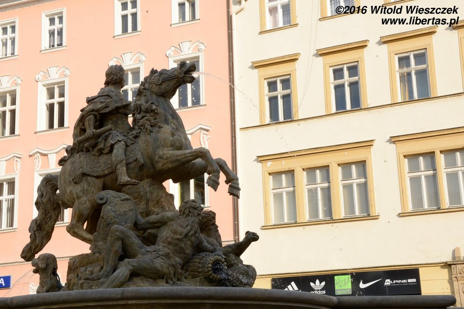 Pierwsza wersja fontanny została ukończona w 1707 roku, a ozdabiał ją posąg przedstawiający św. Floriana autorstwa Wacława Rendera. Jednak w tej postaci istniała zaledwie niecałe 30 lat. Może uznano, że wszystkie fontanny powinny nawiązywać do tradycji antyku1 i św. Florian musiał ustąpić miejsca ojcowi bogów – Jowiszowi – ciskającemu pioruny władcy nieba i ziemi, który stoi w tym miejscu od roku 1735. Jowisz trzymający w prawej dłoni wiązkę piorunów wyrzeźbiony przez pochodzącego z Ołomuńca Filipa Sattlera jest zaliczany do najcenniejszych barokowych zabytków na Morawach. A św. Florian? No cóż, został przeniesiony na podwórze folwarku miejskiego w Skrbeni (Skrbeň), gdzie ponoć całkiem nieźle się trzyma i można go oglądać do dziś.
