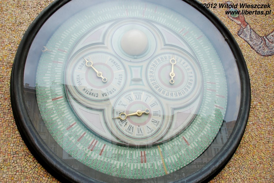 Na północnej ścianie budynku znajduje się kolejna atrakcja przyciągająca wzrok turystów – zegar astronomiczny, który mało tego, że odmierza czas, pokazuje dni, miesiące, fazy Księżyca czy położenie gwiazd, to jeszcze zdaje się mieć w sobie zamknięty kawałek dawnej socjalistycznej rzeczywistości. Ściany wysokiej na 14 metrów ostrołukowej wnęki mieszczącej zegar pokrywa socrealistyczna mozaika autorstwa Karela Svolinskiego. Niemal z każdego kawałka dzieła bije po oczach etos pracy, ale przecież nie tylko pracą socjalistyczny człowiek doskonały żyje! Wysoko nad naszymi głowami wprawiana w ruch mechanizmem zegara klasa robotnicza wesoło paraduje, a przygrywają jej trąbka, flet i miarowe uderzenia kowalskiego młota...