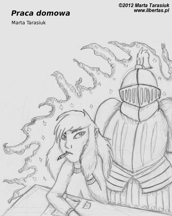 Odwróciłam się. Mym oczom ukazała się półprzezroczysta postać rycerza. Ogarnęła mnie wściekłość. Pomysł na wypracowanie był tak blisko, a przez martwego od kilkuset lat faceta z garnkiem na głowie wszystko mi umknęło, dlatego zamiast dać duchowi mapę Polski fuknęłam: