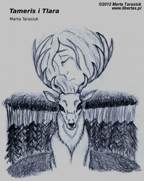 Tego dnia Tameris wybrał się do lasu, na wszelki wypadek zabierając ze sobą łuk. Chociaż w gospodarstwie niczego im nie brakowało, odrobina dziczyzny stanowiłaby miłe urozmaicenie jadłospisu. Najwyraźniej Pani Szczęścia, Fortuna, postanowiła się doń uśmiechnąć, bo ledwie wszedł w gęstwinę, zobaczył przed sobą wspaniałego jelenia.