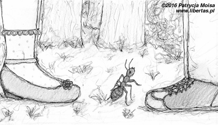 Słońce już zaszło i zrobiło się ciemno. Mrówka była sama i bardzo się bała, a nie miała gdzie się schować. W oddali zobaczyła dwa świecące punkty, które zbliżały się w jej kierunku. Był to wilk. Zauważył mrówkę i już chciał ją połknąć na przekąskę, ale mrówka szybko zorientowała się, co wilk chce zrobić i uciekła do małej dziurki w korzeniach drzewa. Spędziła tam noc, a nad ranem ruszyła dalej.