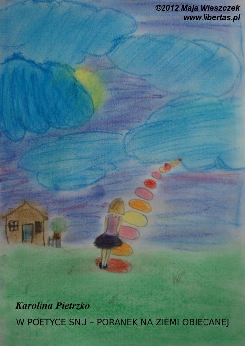 Stąpając radośnie wśród potężnych gór z wierzchołkami okrytymi białym puchem, po cudownie pachnącym szafirowym niebie, zmierzała do tajemniczej małej chatki. Ochoczo wyszedł z niej maluśki, ledwo człapiący, ale uśmiechnięty z marszczonym noskiem szczeniaczek – jej towarzysz podróży, przytulanka. Była chyba siódma. Szczeknął trzy razy, by z niebiańskiego puszystego obłoku wyłoniły się tęczowe ruchome schody.