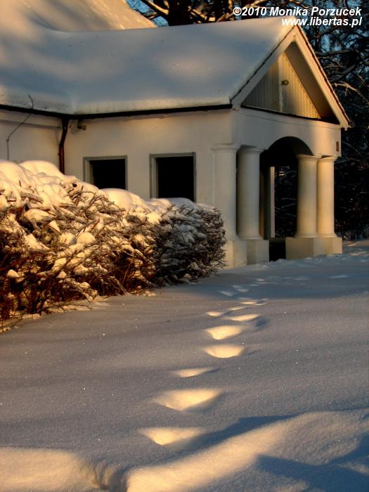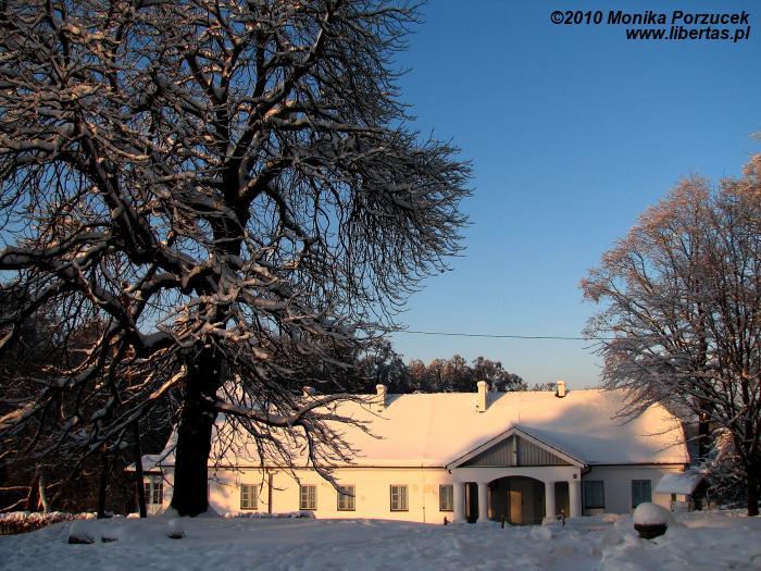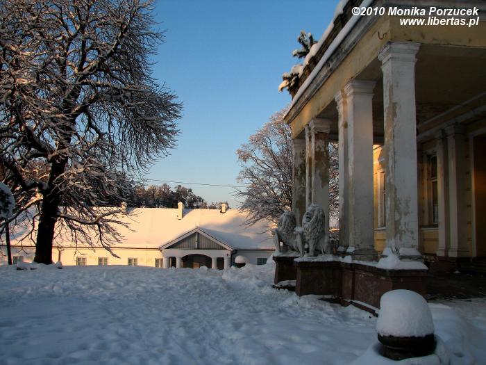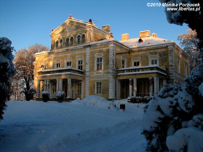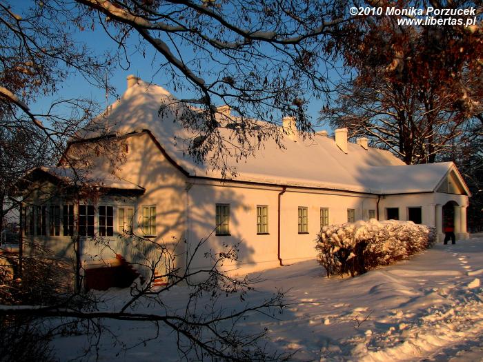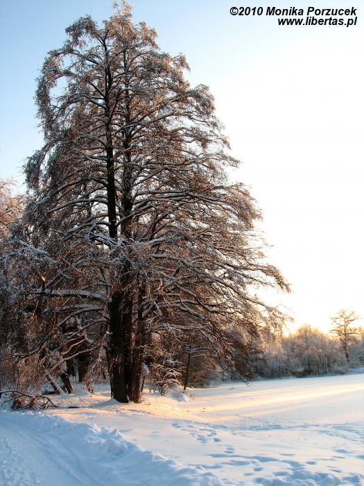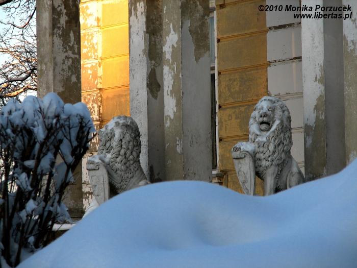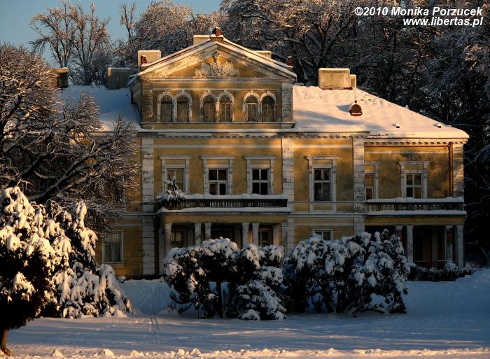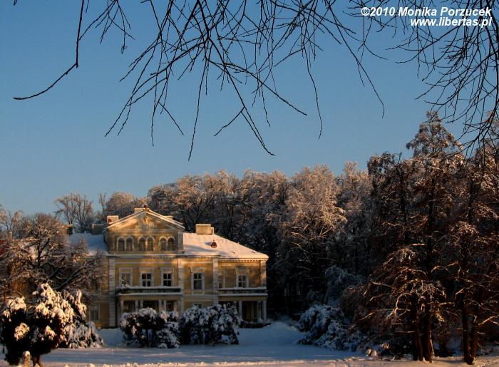Było mroźne styczniowe popołudnie kiedy dotarłam do Złotego Potoku. Pałac Raczyńskich dostrzegłam już z daleka, stojąc na przeciwległym brzegu zamarzniętego stawu Irydion. O tej porze roku w pałacowym parku drzewa i krzewy odpoczywają, z trudem więc wypatrywałam oznaczonych w przewodniku trzydziestu najstarszych weteranów wśród drzew, którymi są: modrzew japoński, dąb bezszypułkowy, jesion wyniosły, tulipanowiec amerykański i pomnik przyrody trzystuletni dąb szypułkowy. No cóż, bez liści wszystkie drzewa wyglądały dla mnie tak samo, będzie trzeba tu wrócić latem lub na wiosnę. Pozostaje mi obejrzeć pałac przynajmniej z zewnątrz.