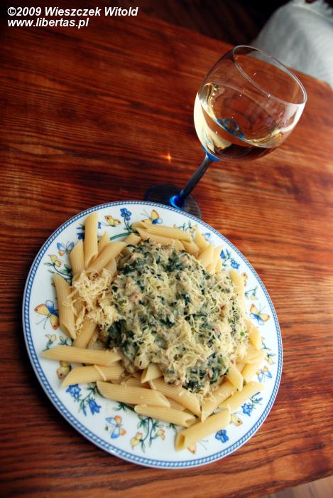 Wracając ze sklepu samoobsługowego człowiek wstępuje na chwilę do lokalnej restauracji U Danusi niby to popatrzeć za ile kebab, za ile cola, a za ile bakterie coli, a tymczasem cichaczem gwizdnie z lady 4 jednorazówki z solą i 2 z pieprzem, kiedy pani Danusia nie patrzy bo skrawa kebaba do kuwety. Zadowolony może udać się w miejsce wypoczynku i ostrożnie, żeby nie przewrócić się o któregoś z leżących na podłodze wypoczywających, zabiera się do gotowania makaronu al dente (co oczywiście każdy wie jak się robi). W międzyczasie kroi w ząbki czosnek i wrzuca na gotujący się na małym gazie olej, który, kiedy zaczyna się już rumienić zasypuje pokrojoną w ząbki cebulą i przykrywa, żeby się dusiło. W międzyczasie, kiedy makaron jeszcze nie jest al dente, a cebula tak się dusi z czosnkiem, człowiek budzi najbliżej leżącego wypoczywającego i wykorzystując fakt, iż ów jeszcze nie do końca rozumie "osochozi" bo jest dopiero 13.00 rano, prosi go o pożyczenie scyzoryka multifunkcyjnego i otwiera nim puszkę z tuńczykiem, odsączając zalewę. Następnie dorzuca zawartość puszki do duszącej się tak z czosnkiem cebuli w patelni, dosypuje ziół prowansalskich i gwizdniętego Danusi pieprzu, a następnie niechętnie (bo marnotrawstwo) podlewa całość odrobiną bułgarskiego wina. Tak się to dusi. Makaron natomiast na pewno jest już al dente i można go odsączyć i zahartować zimną wodą niegazowaną, wysoko zmineralizowaną. Następnie człowiek przelewa wrzątkiem szpinak w brykiecie i dodaje do duszących się w patelni wcześniej wymienionych. W odrobinie wrzątku który został, (bo zawsze gotuje się go trochę więcej, jakby co) widelcem rozrabia w misce dwie kostki topionego serka, tak by się w miarę rozsądnie rozdrobnił i przybrał konsystencję sosu. Ów sos wlewa na odkrytą już patelnię i delikatnie miesza całość. Potem może już nałożyć na talerze skropiony delikatnie olejem makaron i nakładać na niego sos. Całość człowiek dekoruje startym parmezanem. Tak powstaje Pasta di Tonno e spinaci, którą człowiek zapija w drodze wyjątku pół wytrawnym bułgarskim białym winem, tudzież wodą niegazowaną wysoko mineralizowaną. Smacznego, wybełkotał jeden z leżących wypoczywających.