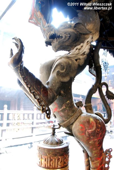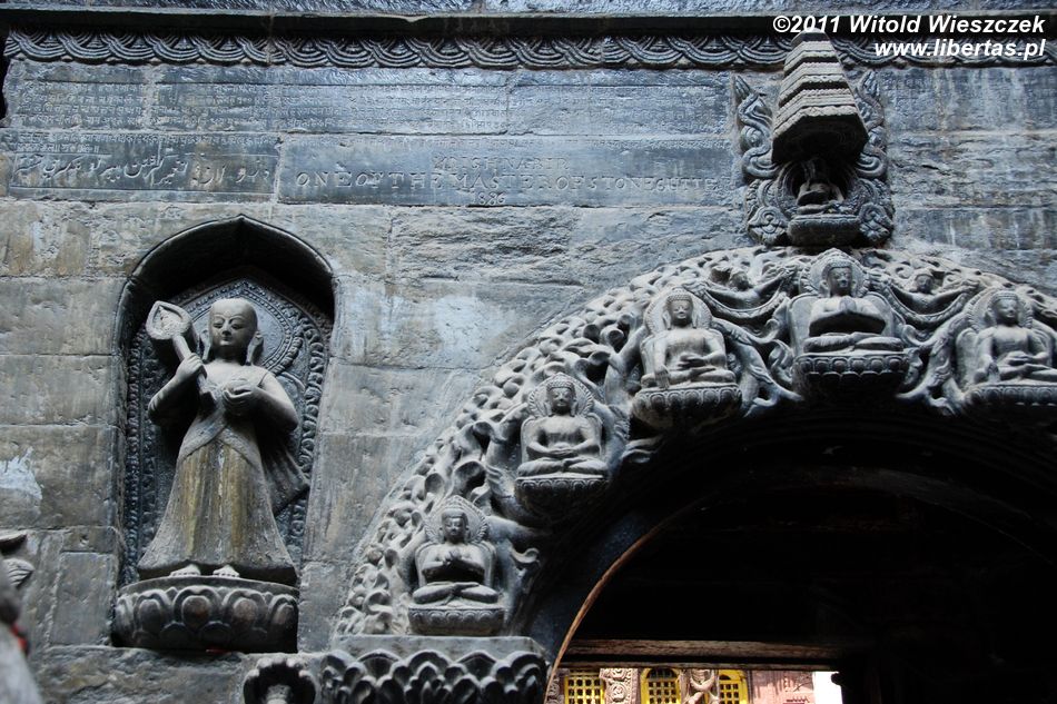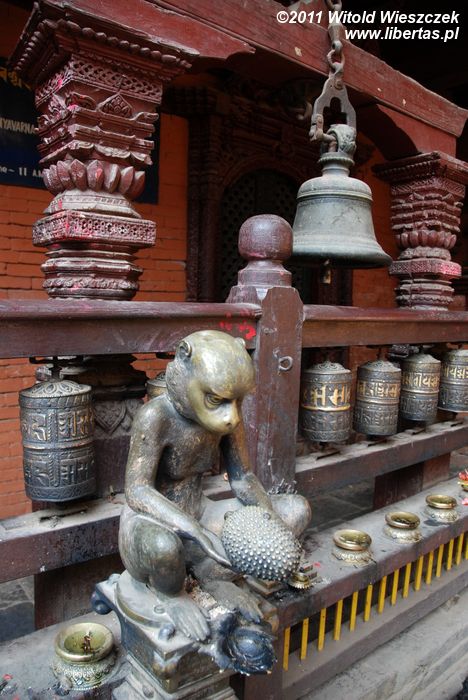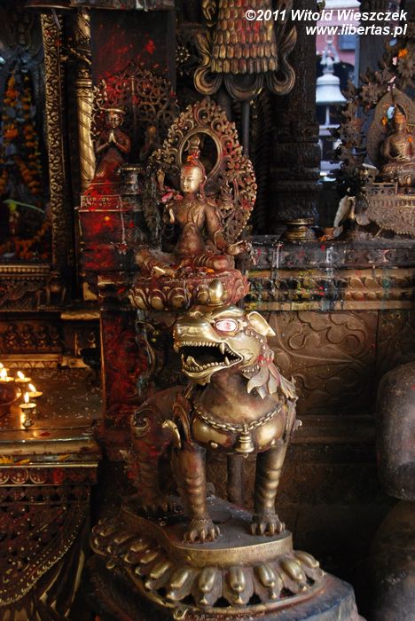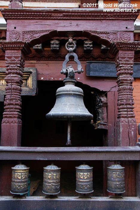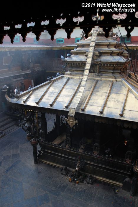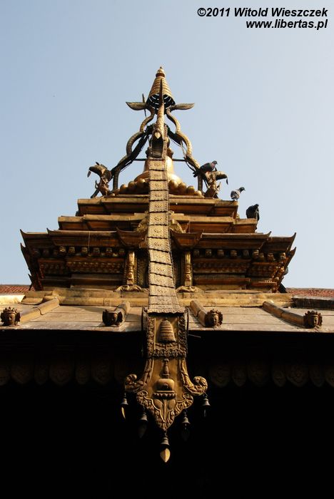 The construction of the complex was begun in the 12th century by the king Vaskar Deva Varma. The entire complex is surrounded by a high wall and the entrance is guarded from the street side by two lions which undoubtedly helps to find this place. Walking further along a narrow passage we are approaching another gate guarded by Shiva and Vishnu carved on two wooden pillars. Behind it there is a small courtyard in the middle of which there is the already mentioned gold-plated pagoda. Inside there is a small stupa connected with the famous Swayambhunath stupa in Kathmandu. As they say it is the oldest part of the complex.