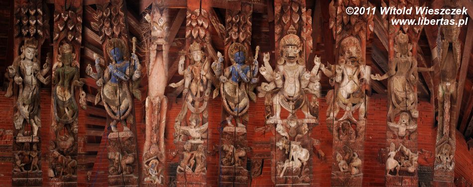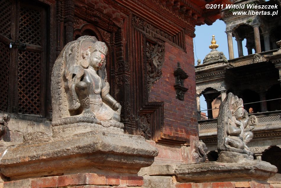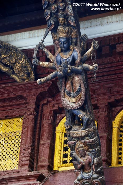 The Krishna Mandir completed in 1637 is the most famous temple on the Durbar Square. It was built by order of the king Siddhi Narasimha Malla after he had seen Krishna and Radha in his dream vision. This beautiful sikhara-topped building erected entirely of limestone is obviously dedicated to Krishna, the Vishna incarnation. This is why Garuda – his white horse ready to fly to the heaven is kneeling on a column in front of the sanctuary. It is also the only temple in Nepal which is crowned by 21 golden peaks. Actually the entire temple was richly ornamented by Newar stonemasons with sculptures which are considered to be ones of the most beautiful sculptures in the whole of Nepal. The craftspeople were inspired in their work by Ramayana and Mahabharata – two major epics of ancient India and Nepal. Who has read these works, will notice well-known scenes on the walls of the sanctuary – on the first floor these ones from Mahabharata, and on the second floor – these ones from Ramayana. Who knows Nepal Bhasa (Nevari language) can even read the inscriptions below them. The other ones, like me, for example, who have neither read Ramayana nor Mahabharata can feast their eyes on the form of the performances themselves.