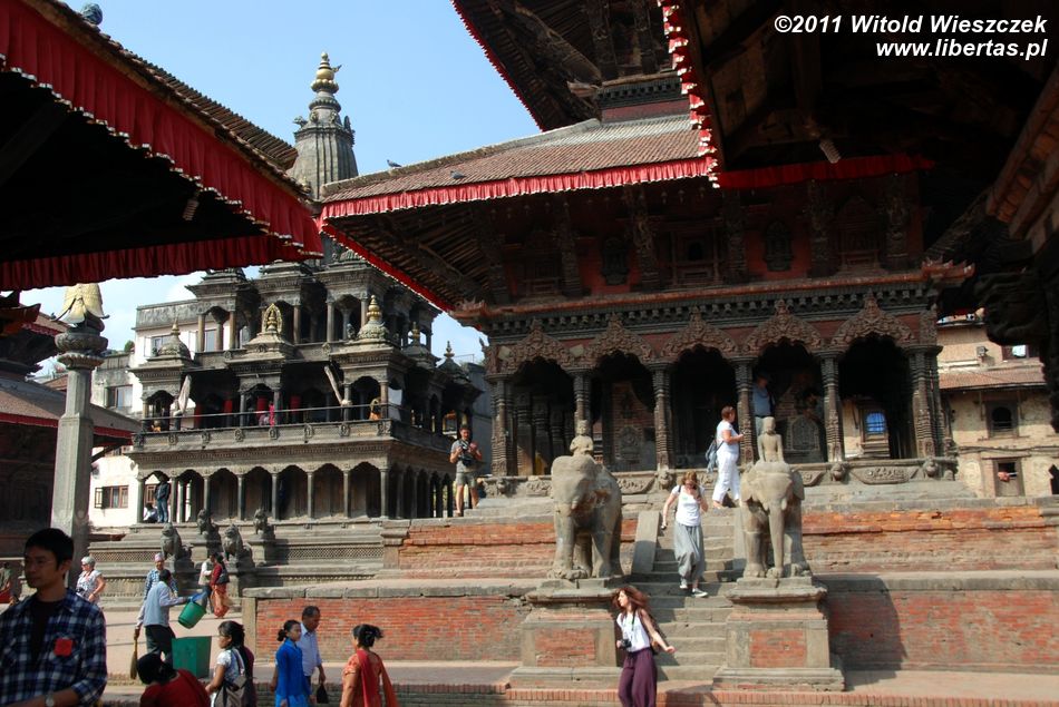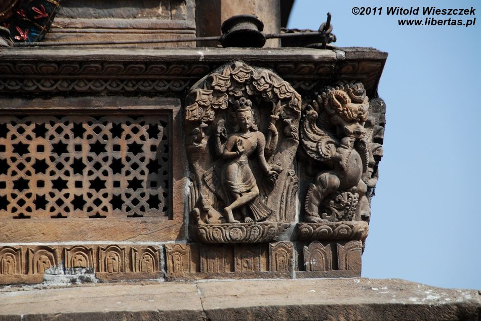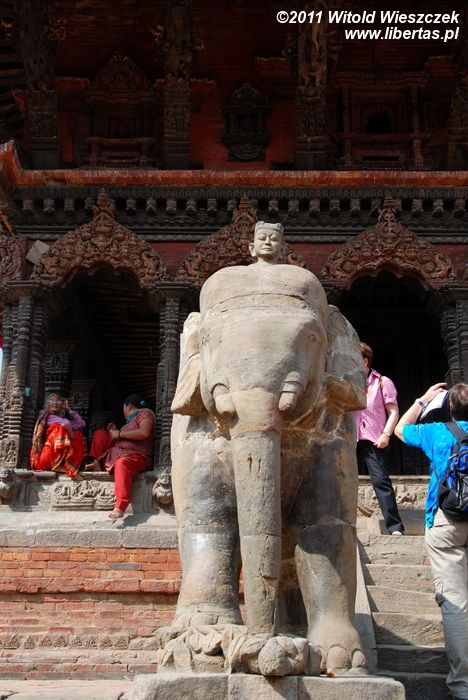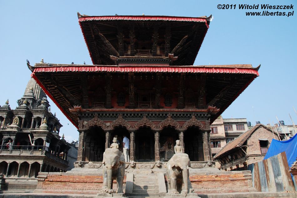 Behind the Krishna Mandir one can admire an equally richly ornamented Shiva Temple (Vishwanath Temple). This pagoda covered with a double-roof was built in 1627. Unfortunately it collapsed in 1990 during heavy monsoon rain, but it still remains a proud of the Royal Palace. The entrance to the sanctuary is guarded by two huge elephants; inside there is a lingam. Relieves with erotic motifs decorate the roof pillars.