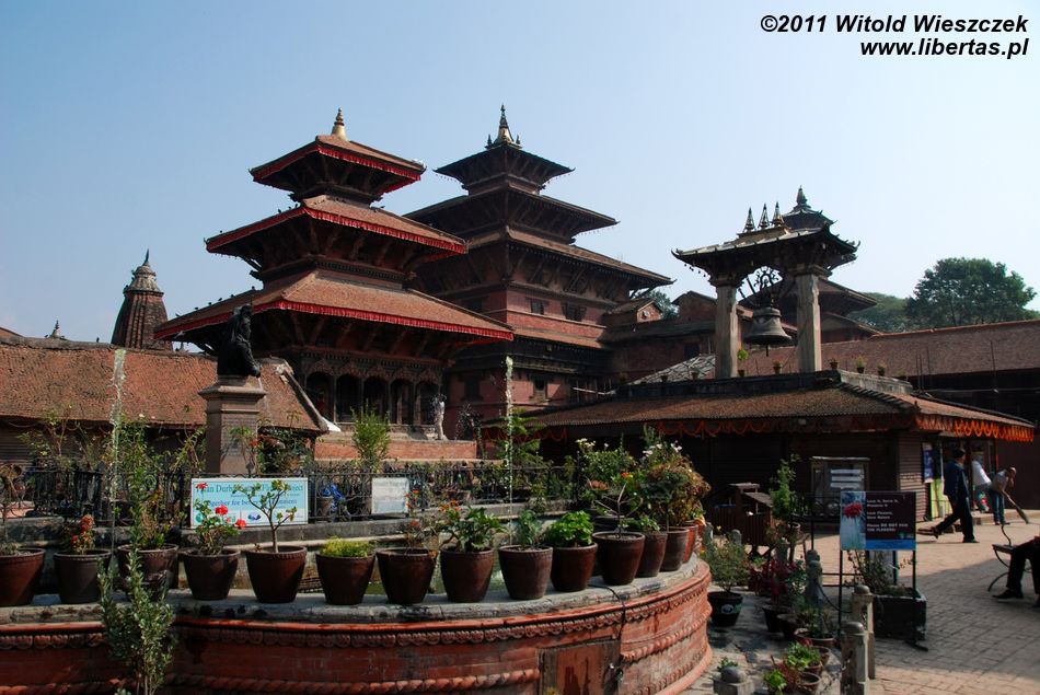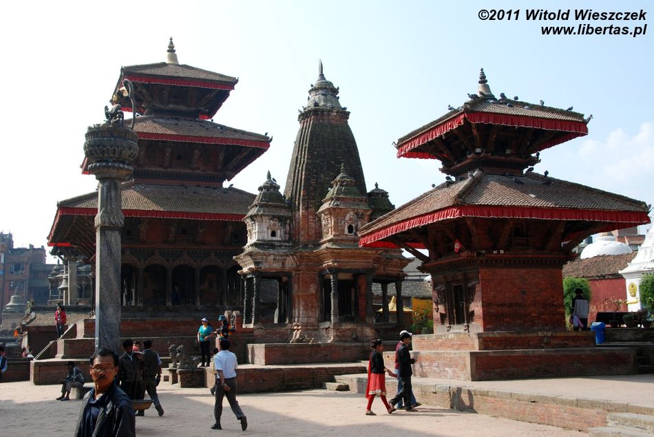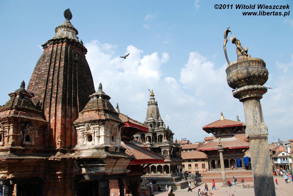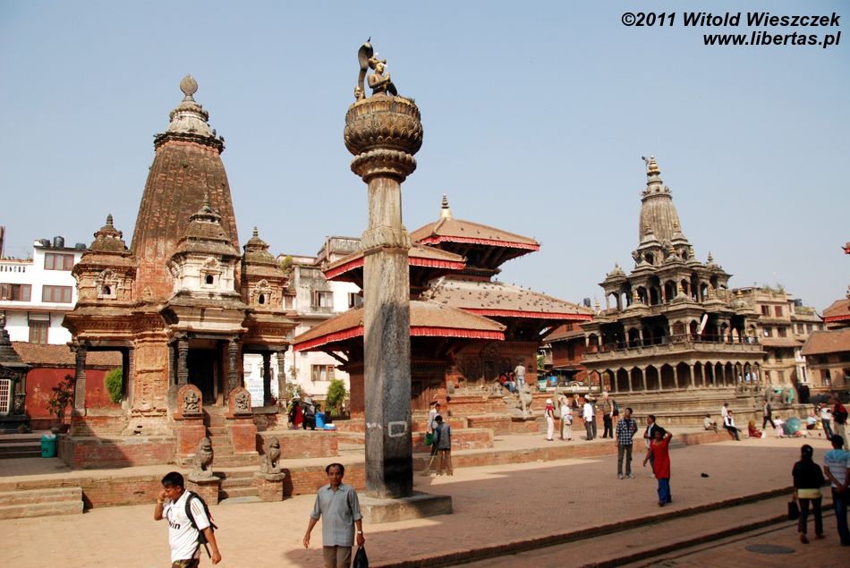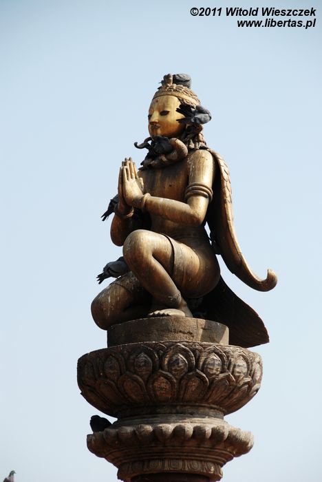 The Temple of Vishnu is a brick sikhara dating back to 1590. Its patron is Narasimha, a Vishnu incarnation portrayed as a half-man and half-lion. In front of the temple there is a column placed here around 1700. The king Yoga Narendra Malla who ruled in the years 1685–1705 is sitting on it and is facing the palace while being protected by a cobra with an umbrella.