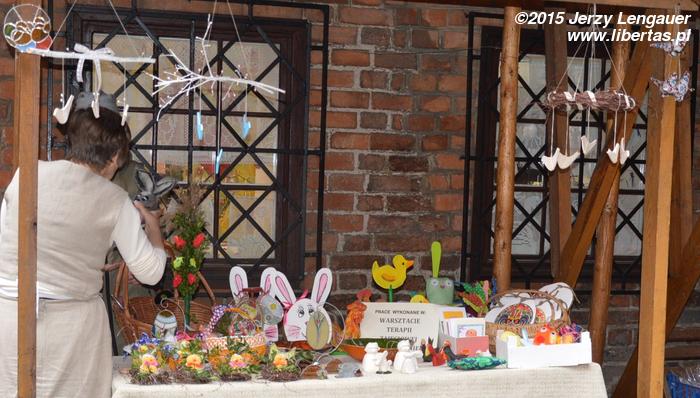 Mniej więcej dziesięć, jedenaście stoisk. Siąpił deszcz, więc jakoś smutno, mało wiosennie i w pogodzie, i na twarzach. Dobrze, że temperatura była raczej bliższa dziesięciu stopni niż zeru i ani podmuchu wiatru. Bardziej sprzedawcom i organizatorom pewnie przeszkadzała wilgoć niż zimno. Mam nadzieję, że tłumnie zrobiło się później, bo około godziny jedenastej przy stoiskach zatrzymywały się ledwo dwie, trzy osoby. Być może odwiedzających przyciągnęły opowieści o tradycjach wielkanocnych i warsztaty wykonywania ozdób świątecznych. Szkoda, że organizatorzy nie poinformowali na plakatach o dokładnych godzinach, w których odbywały się owe, jakby nie było przecież atrakcje. Ja na żadną z tych dwóch nie trafiłem. Szkoda. Świetny pomysł, a zniknął gdzieś w okolicach sobotniego południa.