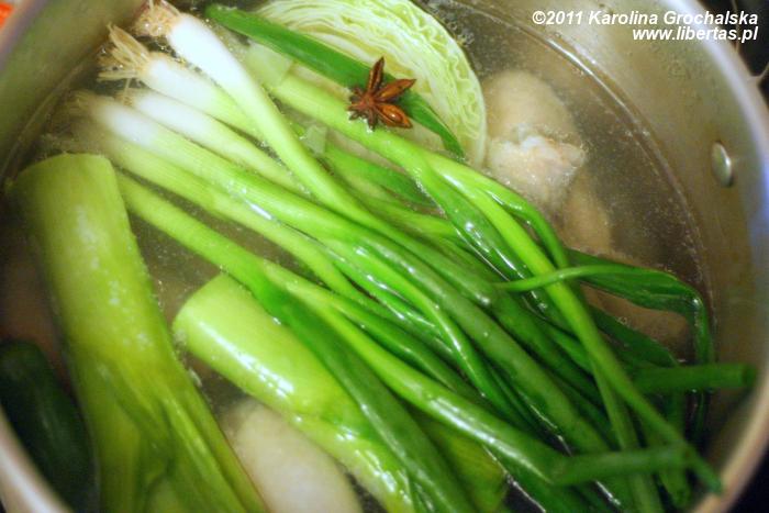 Mięso zalać zimną wodą w pięciolitrowym garze, trzymać na małym ogniu około 20-40 minut, tak aby się nie zagotowało. Zbierać szumowiny do momentu, kiedy wywar będzie czysty. W tym czasie nie mieszać wywaru. Następnie dodać imbir, dymki, całą chilli, czosnek, kapustę, por, pieprz, anyż i sól. Tego wywaru nie wolno doprowadzić do zagotowania – trzymać go na bardzo małym ogniu przez około 2 godziny. Przecedzić przez bardzo gęste sito albo przez muślin. Można schłodzić i zebrać tłuszcz z powierzchni przed podaniem, nie jest to jednak konieczne. Można do smaku dodać sosu sojowego. Bulion jest gotowy do jedzenia lub do zamrożenia.