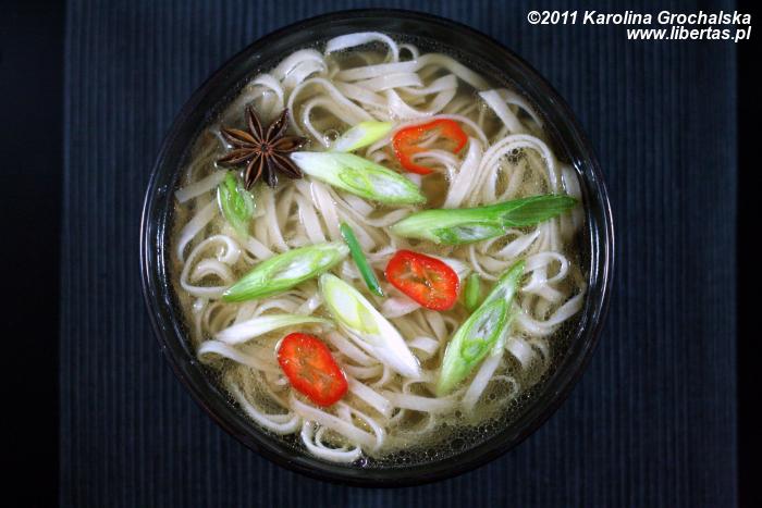 Do miseczek nałożyć ugotowany makaron, zalać bulionem, posypać chilli i dymką. Można udekorować gwiazdką anyżu.