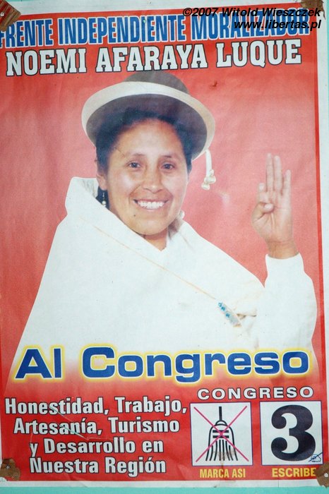 Rano robię zdjęcie upatrzonego plakatu wyborczego, moją uwagę zwracają obrazki na dole, nie wiem, czy się dobrze domyślam, ale wygląda mi to jak agitacja dla niepiśmiennych poprzez pismo obrazkowe. Tylko co ma znaczyć ta przekreślona miotła? Postulat wyborczy, żeby kobiety przestały zamiatać? Jeśli ktoś wie, to proszę o wyjaśnienie.