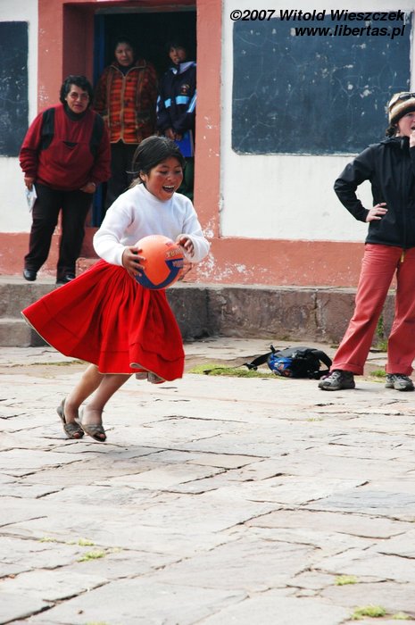 Na wyspie odwiedziliśmy szkołę. Dzieci musiały przez nas przerwać grę w piłkę i wejść do środka. Nauczycielka wygłosiła krótkie przemówienie powitalne, a później namówiła dwie zawstydzone, ubrane w czerwone spódniczki dziewczynki, by zaśpiewały piosenkę dla turystów.