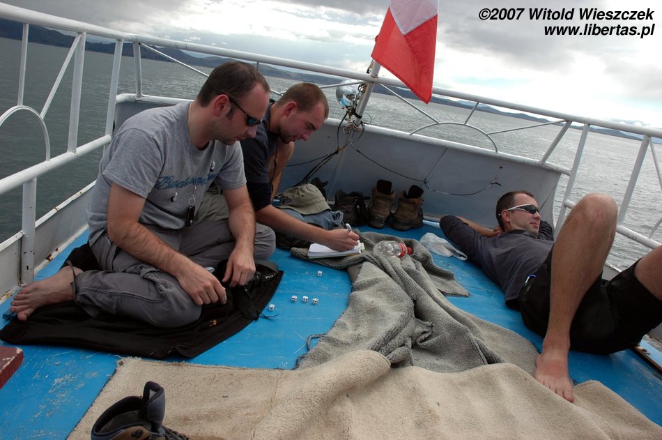 W każdym razie po śniadaniu równie niesmacznym jak wczorajszy obiad i kolacja wypływamy z powrotem żegnani przez przerzedzony komitet pożegnalny.
