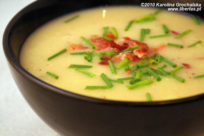 Na suchej patelni uprażyłam bekon, aż był chrupiący, posypałam nim zupę rozlaną do miseczek, a na górę nożyczkami pocięłam z grubsza szczypiorek.