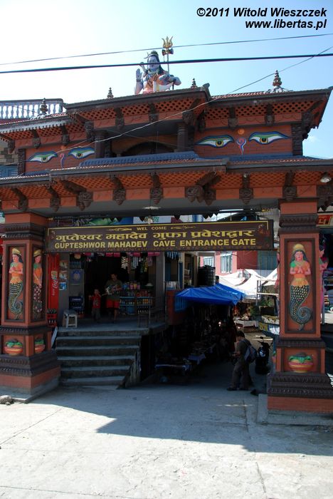 Po drodze mijamy także wejście do wapiennych jaskiń Gupteshwor Mahadev, które są otwarte dla zwiedzających. Znajdujące się w jaskini stalaktyty i stalagmity przypominały ponoć mieszkańcom bogów, może dlatego wejście do jaskini wygląda trochę jak obiekt sakralny.