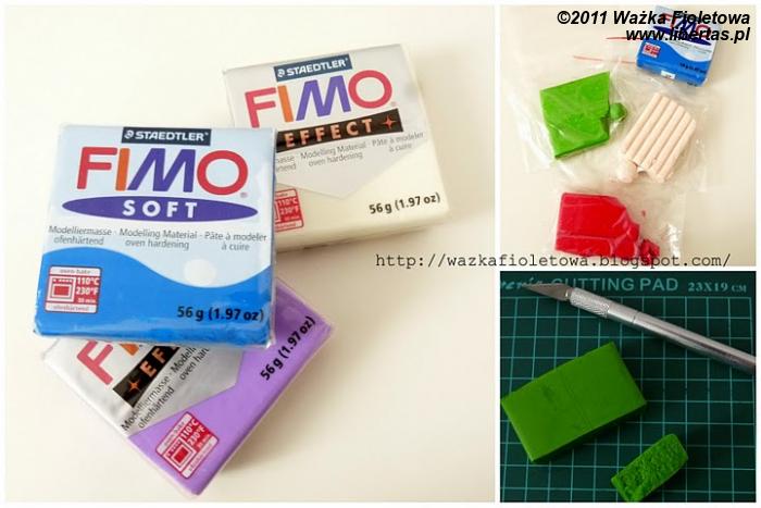 Masa termoutwardzalna – w wybranych (zgodnie z upodobaniami) kolorach. Fimo jest dostępne w ogromnej palecie kolorystycznej. Można znaleźć także z drobinkami brokatu, kolory neonowe, fluorescencyjne albo z efektem transparentnym (świetne do oklejania świeczników) Istnieją podobne masy utwardzalne np. CERNIT. Ale żadne inne dla mnie nie sprawdzają się tak samo dobrze. Nie dają tak wielu możliwości kolorystycznych.