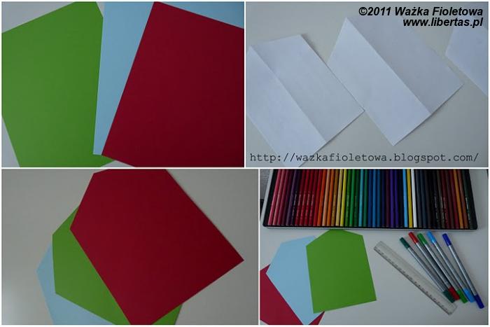 Z arkusza A5 złożonego na pół według dłuższej krawędzi odcięłam brzeg – tak, by utworzyła się 'strzałka'. Widać na powyższym zdjęciu.