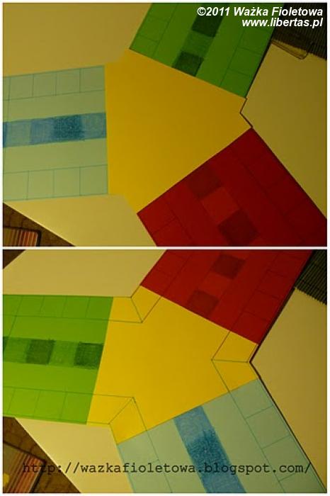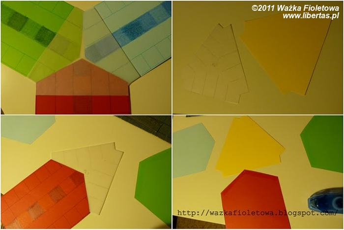 Kalka ułatwia mi ocenienie wielkości wymaganego wewnętrznego żółtego trójkąta. (jestem przekonana, że ktoś kto jest bliżej zapoznany z konstruowaniem przestrzennym to znajdzie na to łatwiejszy sposób). Kalką później podklejam spodnią część planszy. Żółty trójkąt naklejam na wierzch i łączę trasy pionków – tak, by można było przejść drogę wokół krawędzi planszy.