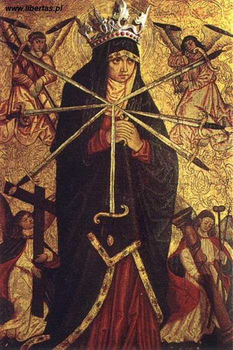 Pierwszy miecz to spełnienie przepowiedni Symeona, drugi – Matka Boża pod Krzyżem, trzeci – zdjęcie Jezusa z krzyża, czwarty – martwe ciało na kolanach Matki, piąty – lament nad światem, szósty – złożenie ciała Jezusa do grobu, siódmy – rozmowa duszy z Matką Bolesną.