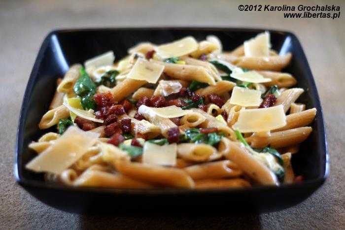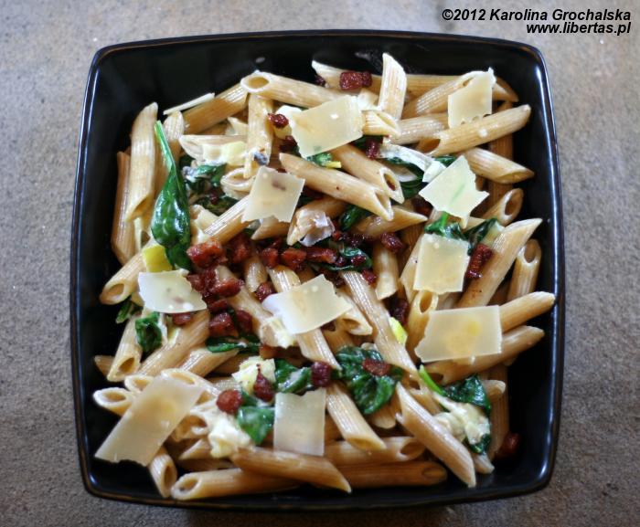 W głębokiej patelni lub rondlu usmażyć na oliwie por, aż będzie miękki. Dorzucić czosnek i smażyć jeszcze minutę. Dodać śmietanę i ser. Trzymać na ogniu, aż śmietana się zagotuje, a ser rozpuści. Doprawić solą, pieprzem i gałką muszkatołową. Dodać szpinak i zamieszać, trzymać na małym ogniu, aż szpinak delikatnie zwiędnie. W tzw. międzyczasie na suchej patelni wysmażyć boczek, aż będzie chrupiący, ugotować makaron al dente (na półtwardo) i przy odcedzaniu zachować kilka łyżek wody spod makaronu. Dodać ją do sosu i dokładnie wymieszać. Odcedzony makaron dorzucić do sosu i dokładnie wymieszać. Nałożyć do miseczek, posypać boczkiem i parmezanem. Podawać od razu.