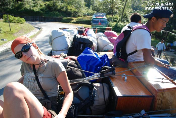 Jazda na dachu długo nie pozwala nam się rozluźnić. Przez pierwsze pół godziny w lekkim przykurczu leżymy na stercie walizek, toreb oraz wszelakich pakunków i z całych sił trzymamy się metalowych części bagażnika. Wraz z upływem czasu ten niecodzienny sposób podróżowania coraz bardziej przypada nam jednak do gustu. Resztka obaw pryska, gdy na naszych oczach dwóch Nepalczyków, którym najwyraźniej w środku zatłoczonego autobusu zrobiło się zbyt duszno, podczas jazdy przenosi się na zewnątrz. Poważnie! Autobus kolebiąc się mocno na boki pędzi po serpentynach 50 km/h, a dwaj śmiałkowie przez okno wdrapują się na dach. I co najlepsze, nikogo to nie dziwi, na nikim, oprócz nas rzecz jasna, nie robi wrażenia. Ot, taki normalny miejscowy zwyczaj. Mamy więc teraz towarzystwo, a co za tym idzie, okazję do zamienienia kilku słów. Niestety, tym razem bariera językowa nie pozwala na zbyt wiele. Panowie znają angielski mniej więcej w tym samym stopniu, co my nepali. Zrozumieliśmy zaledwie, że jadą do pracy, oni zaś dowiedzieli się, że mieszkamy w Polsce, absolutnie anonimowym dla nich kraju, graniczącym ze słynnymi tutaj Niemcami.