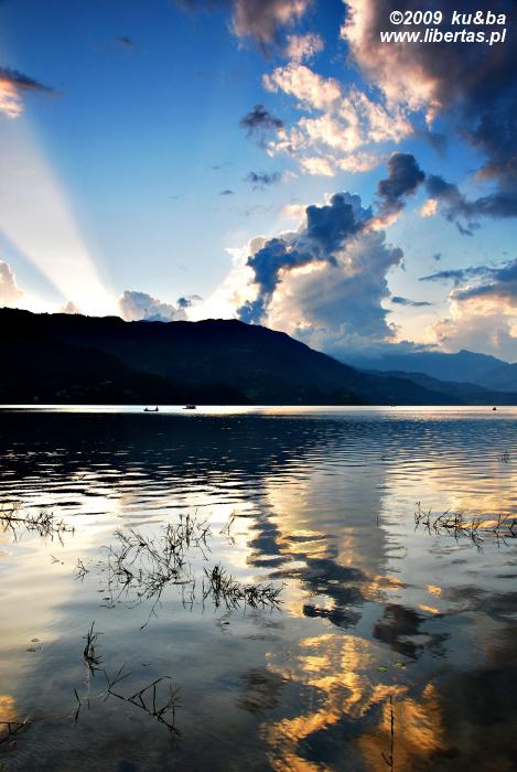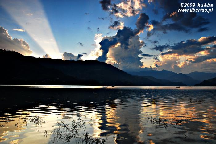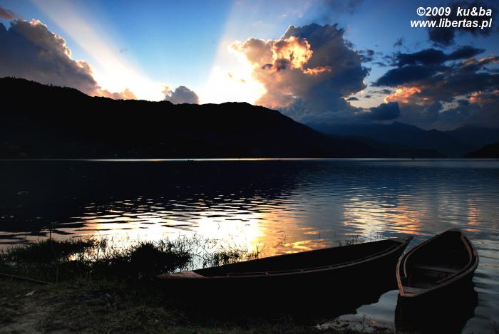 Dzisiejsze, skromne zapiski w całości sponsoruje literka „p”, jak Phewa Tal. Tak się jakoś złożyło, że chociaż samej Pokharze poświęciliśmy już wcześniej sporo zdań (patrz: Część I), to o jej największym skarbie zaledwie wspomnieliśmy. Niedopatrzenie. Owo przepiękne jezioro to przecież, obok malujących się ponad jego wysokimi brzegami wspaniałych himalajskich panoram, najważniejsza tutaj atrakcja, czyniąca Pokharę miejscem naprawdę wartym odwiedzenia. Dla nas Phewa Tal jest aktualnie głównym animatorem wolnego czasu. Każdego ranka przynosi nam tak potrzebny w tym karmionym obficie słońcem krajobrazie chłód, później zaprasza do orzeźwiającej kąpieli i na łodziach wozi nas po swojej srebrnej skórze, wieczorem zaś, wespół z zachodzącym słońcem, staje się aktorem niebywałych, obfitujących w niezwykłe barwy przedstawień. Cały dzisiejszy dzień korzystaliśmy z serwowanych przez jezioro dobrodziejstw. Chęci podpowiadają nam, że dzień jutrzejszy urządzić powinniśmy podobnie.