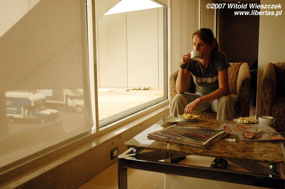 Jeszcze na lotnisku w Limie poznaję bardzo sympatyczną Węgierkę, która została postawiona przez linię KLM w identycznej sytuacji jak my. W oczekiwaniu na samolot spędzamy razem noc na lotnisku, zapijając czas piwem marki Cusquena.