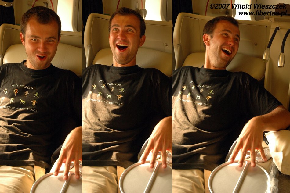 Jest tak fajnie, że na pokład samolotu wchodzimy chyba jako ostatni! Powiedzcie sami czy nasz Boeing 747 (maksymalna prędkość 0.85Ma) nie jest słodki? Ale prawdziwy szok czeka nas w środku! Szczepan po pięciotygodniowej abstynencji dostaje orgazmu na fotelu, który ma więcej guzików niż najbardziej wypasiony odtwarzacz mp3! Można się zacząć zastanawiać nad zmianą zawodu! Zresztą zobaczcie sami!