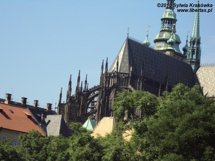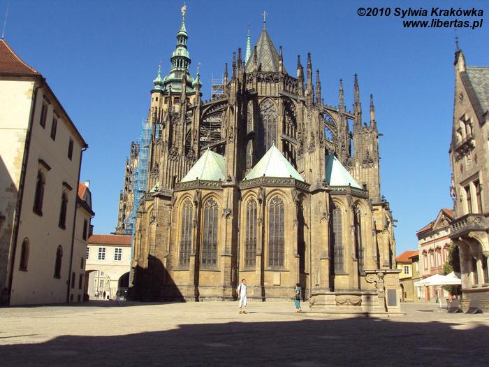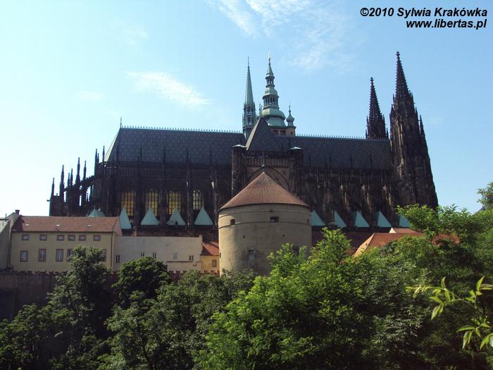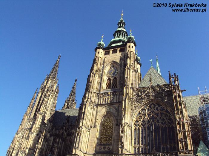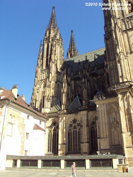 Katedra św. Wita była kościołem parafialnym czeskich władców. Budowa świątyni trwała 600 lat. Zaczęto ją wznosić w 1344 roku na polecenie Karola IV, a prace czasowa wstrzymana w 1420 roku na skutek wojny husyckiej. Budynek to mieszanka stylów, od gotyku po renesans i barok. Dopiero w XIX i XX wieku starano kierować się pierwotnym projektem katedry i wzorować się na późnogotyckim stylu. Budowa zakończyła się w 1929 roku. Katedra posiada wieżę wysoką na 96 metrów. Główne wejście to tzw. Złota Brama, która powstała w 1367 roku i była dziełem niemieckich artystów. Zabytkowe drzwi przedstawiają sceny z Sądu Ostatecznego.