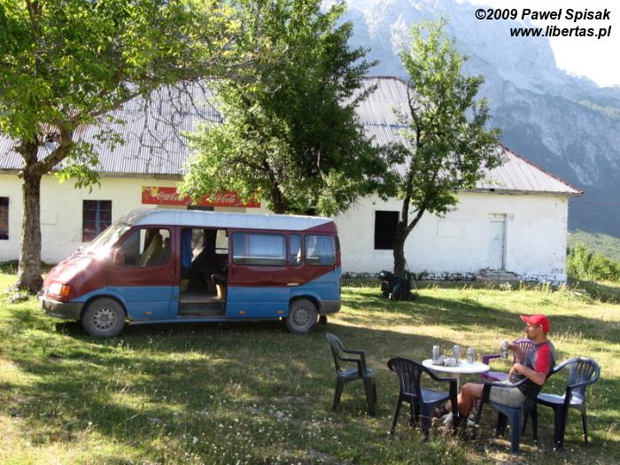 Objuczeni jak woły, w pełnym słońcu zaczynamy iść drogą – do celu przed nami 32 km. Nikt przy zdrowych zmysłach nie będzie szedł z ciężkim plecakiem w albańskim słońcu taki szmat drogi. Wiemy, że poprowadzono szlak z Boge do Thethi przez góry ale i jego pokonanie z tobołkami zajęłoby pół dnia. Postanawiamy złapać okazję. Wiola próbuje przekonać pewnego Albańczyka, żeby zawiózł nas do Thethi, ale ten, choć był bliski przekonania, odmawia z powodu obowiązków zawodowych. Po kilku minutach z góry zjeżdża Ford Transit i sam kierowca zaczyna nas dopytywać, czy nie chcemy przypadkiem do Thethi. Oczywiście, że chcemy, gość spadł nam jak z nieba, bo w takim żarze zasuwać z plecakami to samobójstwo. Po negocjacjach stanęło, że weźmie nas za 45 E. Wcześniej ustaliliśmy między sobą, że pojedziemy za max 10 E/ os. Cena nam pasuje, ładujemy się do busa i ruszamy. Potem okaże się, że przepłaciliśmy, bo w drodze powrotnej wezmą od nas po 500 leków (4 E/ os.).