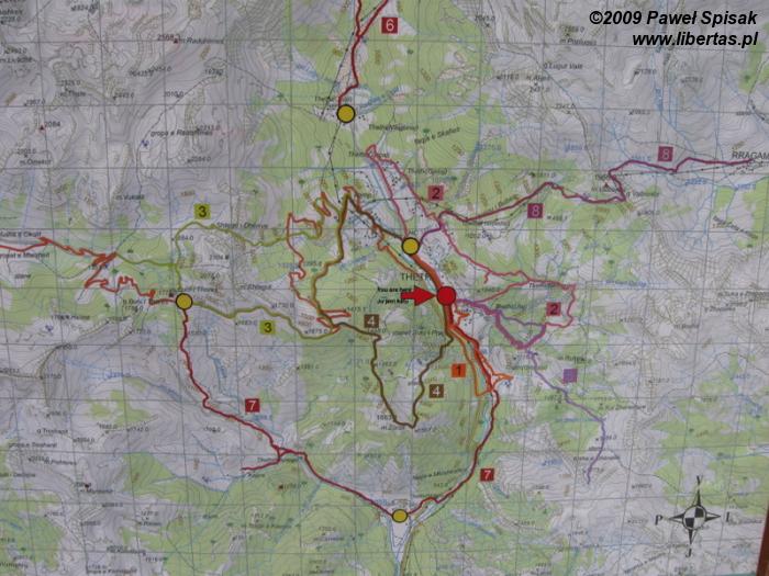 Zaczynamy schodzić w dół drogi, tylko tak naprawdę, to nie wiemy gdzie iść... zatrzymujemy stopa, jakaś półciężarówka zabiera nas na pakę i wysadza na rozstaju dróg przy... mapie! Ooooo mapa, tego się nie spodziewaliśmy! Przecież tu nie mają żadnych map! A jednak. Od razu wzbudzamy zainteresowanie dzieciaków bawiących się w pobliżu. Kiepską angielszczyzną zapraszają nas do siebie, czy to na nocleg, czy na jakieś zakupy. Z mapy wynika, że na przełęcz Qafa Peje wiedzie oznakowany szlak! Nawet pstryknęliśmy mapce fotkę.