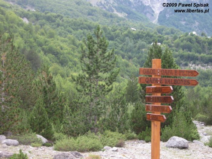 Po około 10 minutach marszu mijamy według nas ostatnie zabudowania i zaczynamy wchodzić do lasu. Ale coś mi nie pasuje, nie ten kierunek, nie mam dość przekonania, że na pewno idziemy dobrze bo nie ma np. charakterystycznego krzyża nad "ostatnią" wodą w Thethi. Skoro już tyle się trudzą ze znakowaniem szlaków, powinni dać znak, że w takim a takim miejscu jest rozejście szlaków na Peje i na Valbonę...
