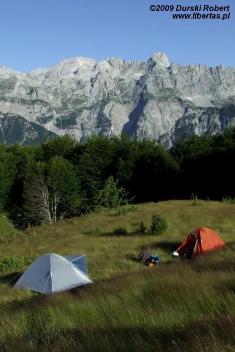 Odświeżamy się, woda jest lodowata, nogi niemal kostnieją. Po napełnieniu butelek na kolacyjne zupki-trupki, rozbijamy obóz - pomiędzy bratankami z Węgier i większym skupiskiem namiotów (czeski obóz). Robimy sobie kolację, a że komary i meszki zaczynają być upierdliwe, nie siedzimy za długo. Podziwiamy tylko Popluksa w zachodzącym słońcu, nawet nie przypuszczając, że nieco w lewo widać przecież Jezercesa, nasz cel na kolejny dzień...