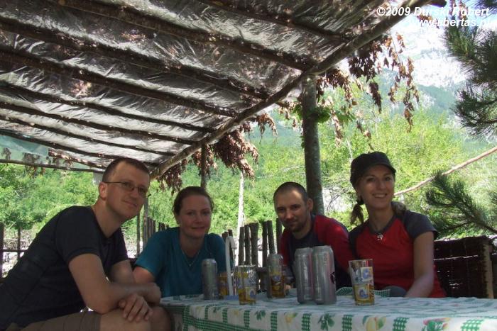 Po dojściu do "głównej" drogi decydujemy się iść wzdłuż niej w prawą stronę obok potoku. Przez jakiś czas nie ma żadnych znaków - czyli... jest dobrze! Z mapy wynika, że żeby dojść do szlaku na Qafa Peje trzeba pokonać fragment drogi nieoznakowanej. Idziemy i… trafiamy do BUFE! Tak! to jest TO bufe Zamawiamy "kater birra", pijemy ze smakiem złocisty trunek, spoglądamy na piekącego się baranka i obiecujemy sobie w drodze powrotnej wstąpić na sztukę mięsa.