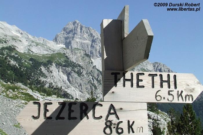 Musimy iść dalej, słońce wcale nie chce odpuścić... mozolnie zdobywamy wysokość modląc się, żeby nasza przełęcz była za następnym zakosem. Nasze tempo znacznie spada. Ja mam ochotę zrzucić ten plecak, po kiego się tak męczyć? Robimy częste postoje szukając kawałka cienia, a tego jak na lekarstwo. Powoli zaczyna kończyć się woda. Idziemy już sporo czasu. Wreszcie, potwornie zmęczeni po kilkugodzinnej wspinaczce, jesteśmy na Qafa Peje. Widzimy charakterystyczny krzyż, są też znaki ile na Majkę, ile w dół do Thethi...