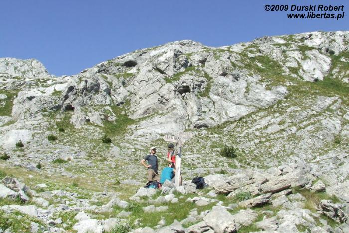 Na przełęczy robimy krótki przystanek. Krótki, bo nie ma cienia. Znaku do naszej bazy w Buni Gropeat nie widzimy, jest znak na Bukurę (?), drogą eliminacji obieramy jej kierunek. Jak się potem okaże Bukura to nasze Buni Gropeat. Paweł nas wyprzedza i robi zwiad - mówię mu, że ma wypatrywać szałasów pasterzy. Gdy wraca przekazuje mi, że widział, ale nie szałasy, a namioty i jeziorko. Zastanowiło mnie to, bo niby skąd tam jezioro??? Ono miało być za przełączą, ale już w kierunku Czarnogóry. Postanawiamy cofnąć się na przełęcz, zejść trochę w dół i tam szukać ścieżki do Buni i Gropeat. Oczywiście popełniamy wielki błąd. Nie ma tam żadnego odbicia, żadnej ścieżki do katunu. Znów odpoczywamy, nie mamy już wody, za to jabłka nigdy wcześniej tak nie smakowały! I pomyśleć, że skarciliśmy Wiolę jak je kupowała, „żadnych owoców! Minimalizacja bagażu!!” Wiola się uparła i chwała jej za to. Jakby było tego mało, popełniam zasadniczy błąd proponując trasę "na skróty" do miejsca, gdzie Paweł widział namioty i oczko wodne. Nie dość, że ostro pod górę, to jeszcze jakieś obejścia, tracimy mnóstwo czasu.