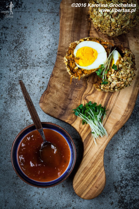 Jajka po szkocku, czyli ugotowane na twardo (choć najlepsze są półpłynne), opatulone mięsem z kiełbasek wieprzowych, panierowane i usmażone na głębokim tłuszczu to bardzo popularny przysmak. Przepisy na nie znajdziecie także na polskich blogach. Ja dziś prezentuję wersję wegetariańską, bardzo smaczną i pikantną, z nutą azjatycką. Cy to nadal jajka po szkocku? Możemy się umówić, że to ich wegetariański odpowiednik. Lubię wersję mięsną, ale to właśnie ta warzywna spowodowała, że moje kubki smakowe krzyknęły „wow!”.